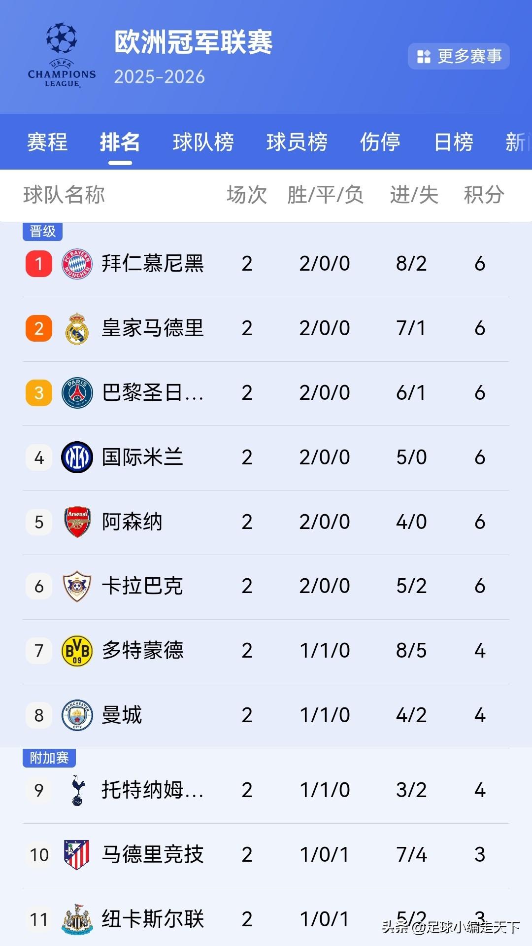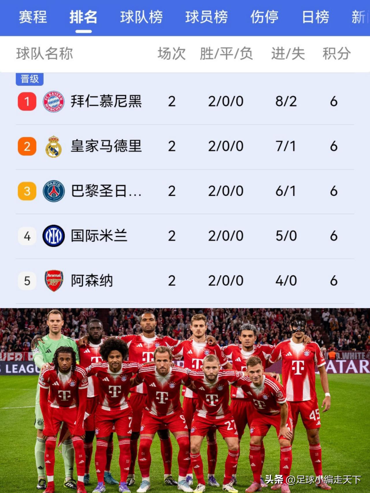 不得不说拜仁今年欧冠好稳啊,绝杀绝平与他无关。这么下去,欧冠决赛就是巴黎对阵拜仁了。 我现在特别期待拜仁和阿森纳巴黎那两场,面对这两个欧洲阵容和状态都满血的球队,看看拜仁能不能顶得住。 话说这卡皮巴拉到底是何方神圣?第一次听说这队啊。 卡拉巴赫:没想到吧?即使就爽两轮也是,爽!!! 欧冠积分榜前五名都来自五大联赛,看来冠军就在这5支球队里面产生了。话说今年大巴黎怎么不装死了?