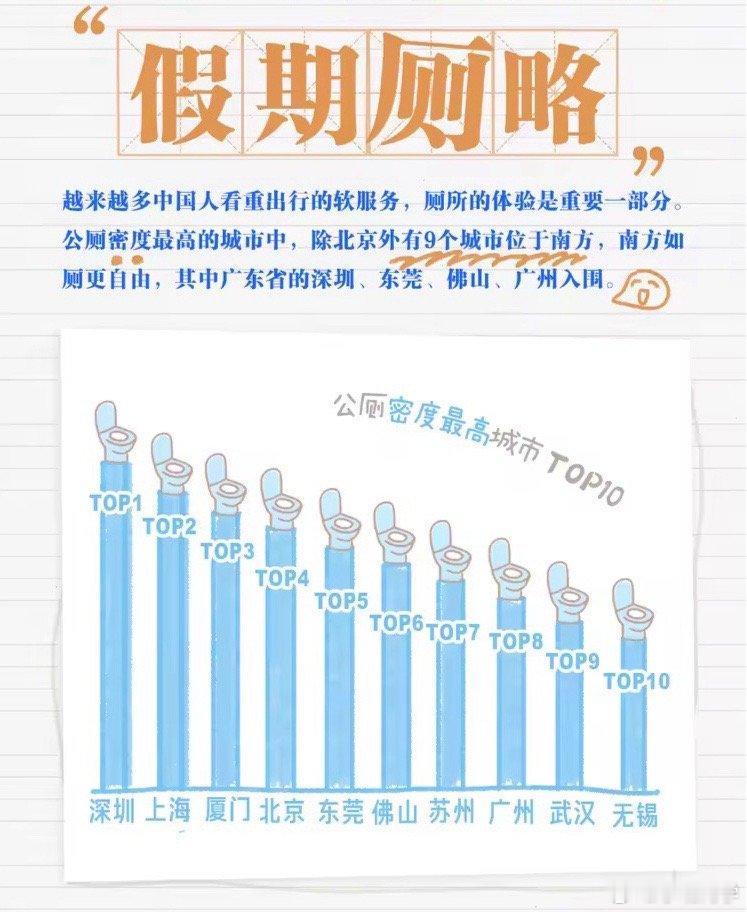 今天高德扫街榜发布了很有趣但也很的榜单——假期“厕略”。在公厕数量排名前九的城市中,只有北京一个北方城市且数量位居第一名,其他八个城市都是南方的,其中成都公厕最忙。