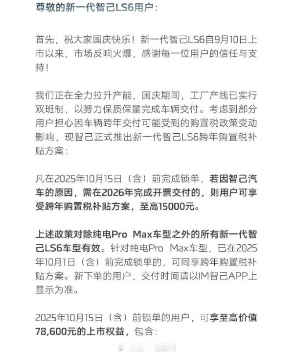 智己LS6也公布了购置税补贴方案,10月15日前锁单的朋友都不用担心购置税问题