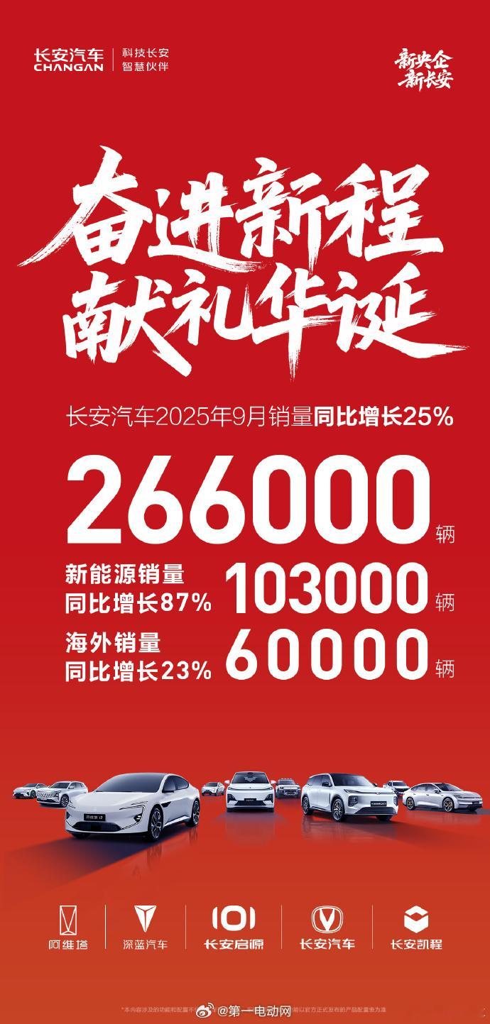 长安汽车9月销量26.6万辆,同比增长25%。新能源9月销量10