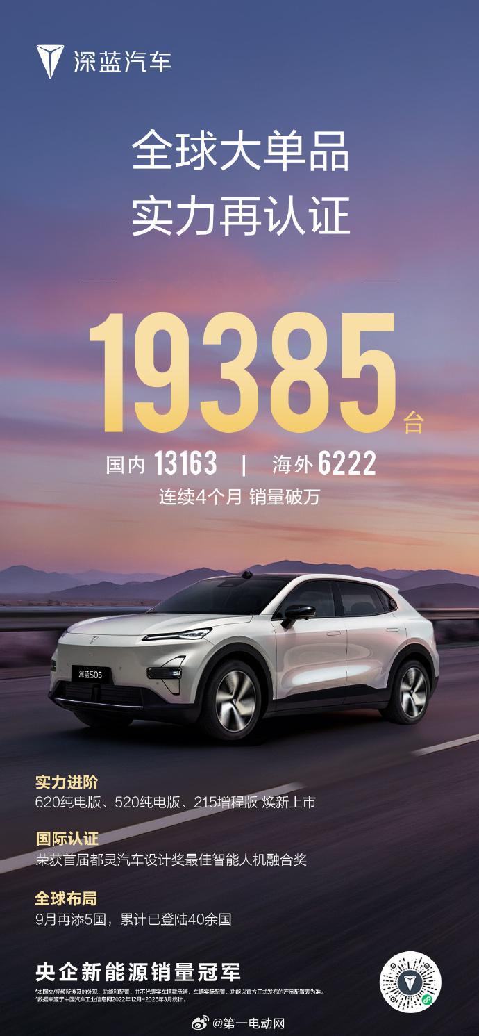 深蓝汽车 9 月全球销量 33626 辆,同比增长 48.1%,环比增长 19.1%