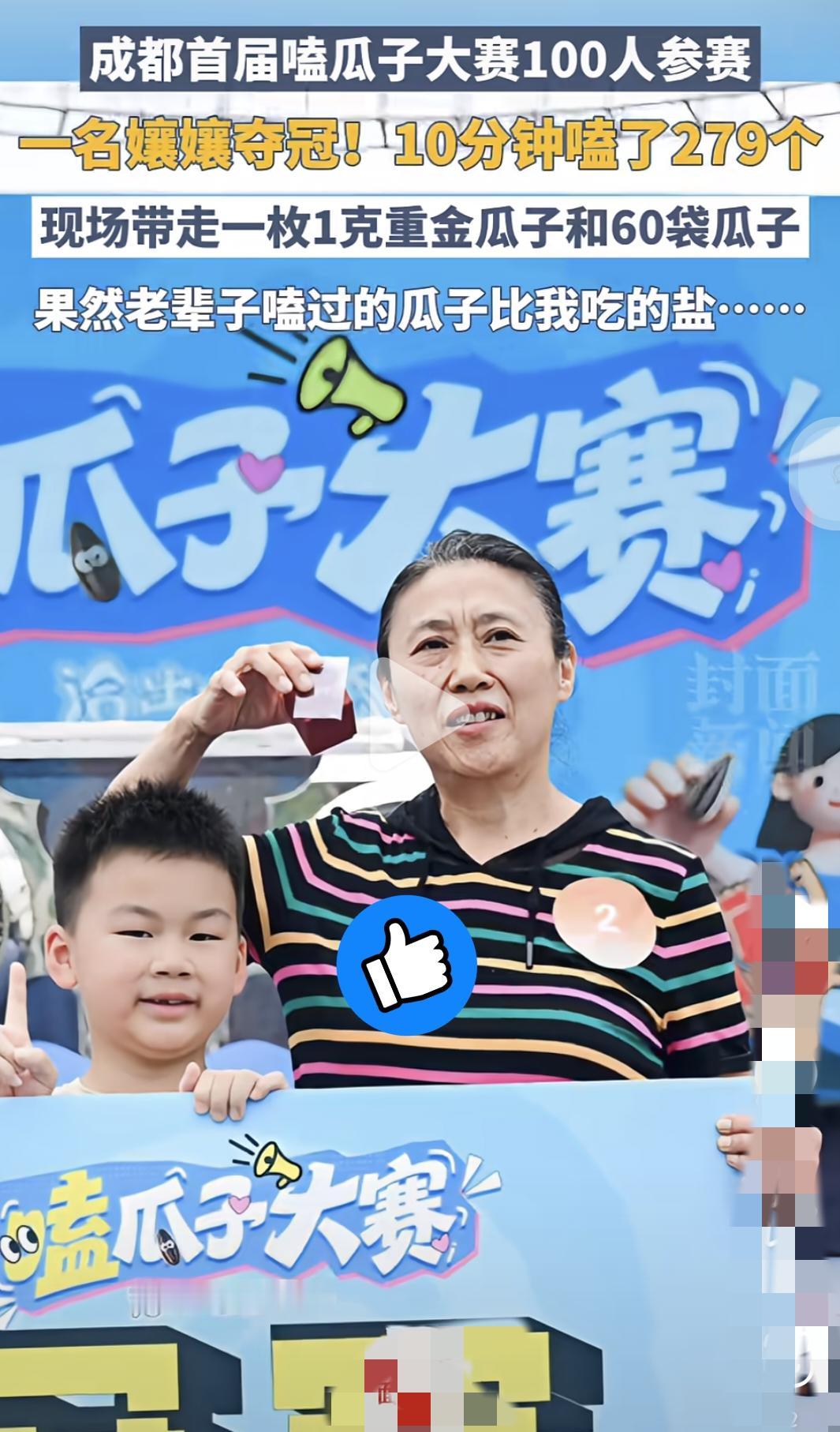 谁能想到! 成都人连嗑瓜子都卷出“天花板”了! 10月1日下午两点,世博园里的嗑瓜子大赛直接嗨翻,100号人分三轮比拼,从4岁萌娃到60岁大爷都凑齐了,10分钟内疯狂“炫”瓜子的场面,隔着屏幕都觉得热闹。 最绝的是冠军,居然嗑了279粒!这哪是比赛,分明是把成都人“会耍、会玩”的特质拉满了——不追高价景点,不挤网红打卡地,转头在接地气的小事里找乐子,这才是假期最该有的样子啊! 你平时一分钟能嗑多少粒瓜子?有没有信心跟这位冠军掰掰手腕?来评论区说说你的“嗑瓜子战绩”!