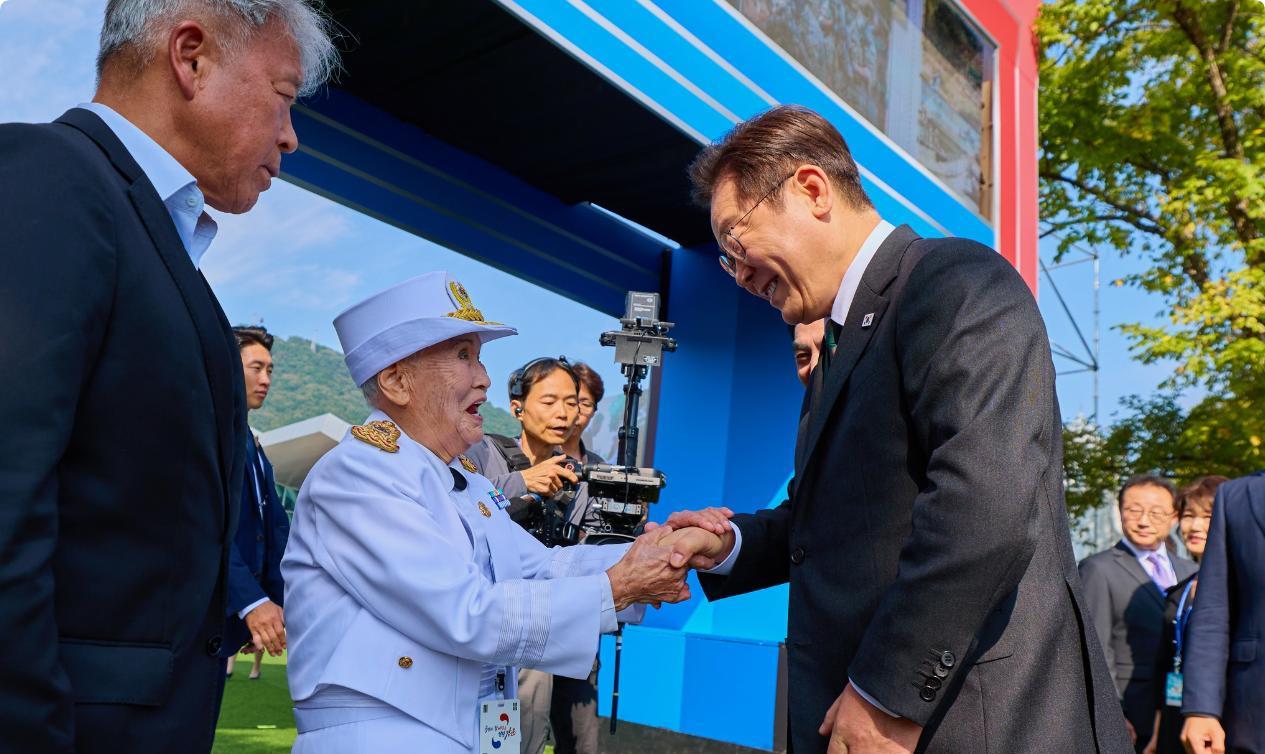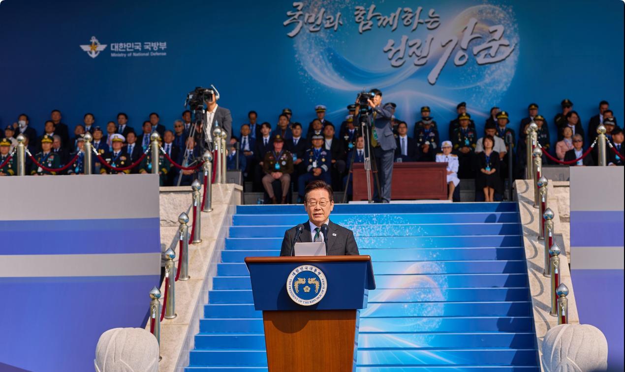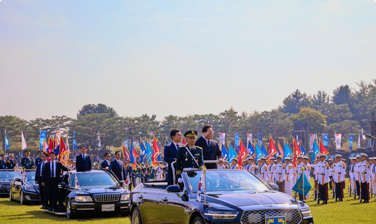 李在明出席建军77周年纪念活动,乘车检阅武装部队仪仗队并行军礼。 时间是10月1
