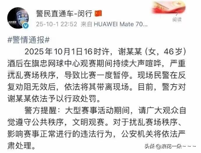 活该?这个女酒疯子在上海网球大师赛观赛期间发酒疯,乱吼乱叫,不断亮护照进行挑衅,导致比赛一度中断,警察多次劝阻无效后,依法把她强制执行抬出场外,等醒酒后对她进行了处罚。 有网友爆料该女子谢某某,长着一身黄皮肤,但是已经远嫁瑞典! 以前听说过国外有足球流氓,没想到现在网球场出现耍泼的女人了?! 大家平时看网球比赛的话,可以发现,看网球的都是很文明的,是需要安静比赛环境的。特别是在运动员发球的时候不能出声,否则会影响人家发球。 这个谢某某应该不是一个正宗的网球球迷。