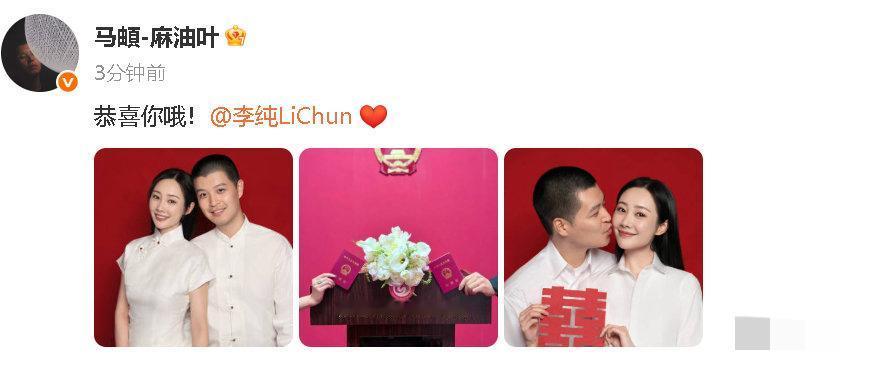 从花千骨到如懿传,没当上师徒,却当上了夫妻!感觉他和王鸥长得好像呀,有点分不清楚[打call]不过祝福姐姐新婚快乐🎊 李纯马頔领证李纯马頔官宣结婚 很喜欢她演的魏嬿婉!! 马頔:南山南可太好写了! 多好呀,大大方方恋爱,敞敞亮亮结婚。祝福,祝福[烟花][烟花][烟花]