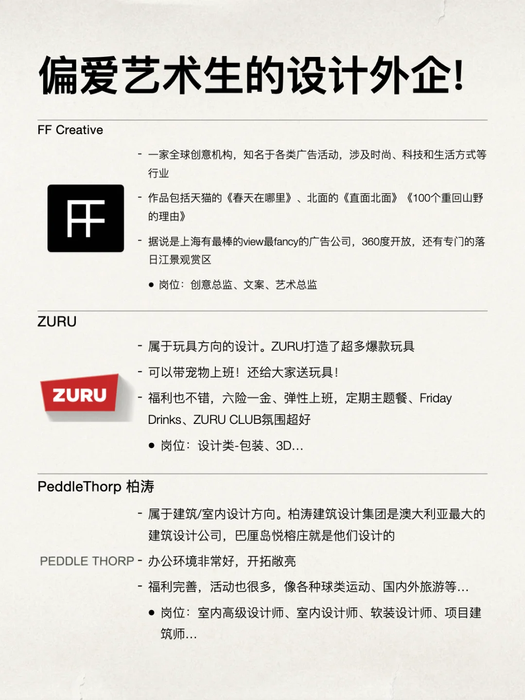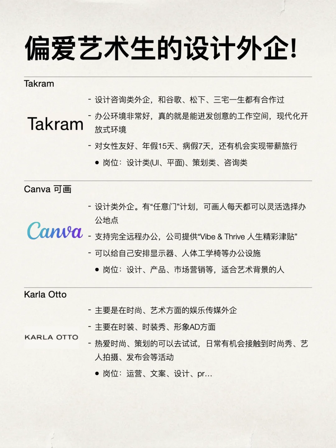 金九银十求职季,真心建议艺术生去冲设计计创意类外企,审美觉醒的当下,设计价值飙升,其实蛮值得去试试的 . 为什么建议艺术生冲设计外企 ✅标准工时是基础,不内卷,环境多元包容,无论背景或性别,专业能力才是硬通货,15天+起步的年假是标配,混合办公模式常见,参与前沿项目,价值感强,扁平化管理,尊重专业,沟通顺畅 . 坚持日更✊🏻,帮大家在找工作路上顺利拿到offer! .