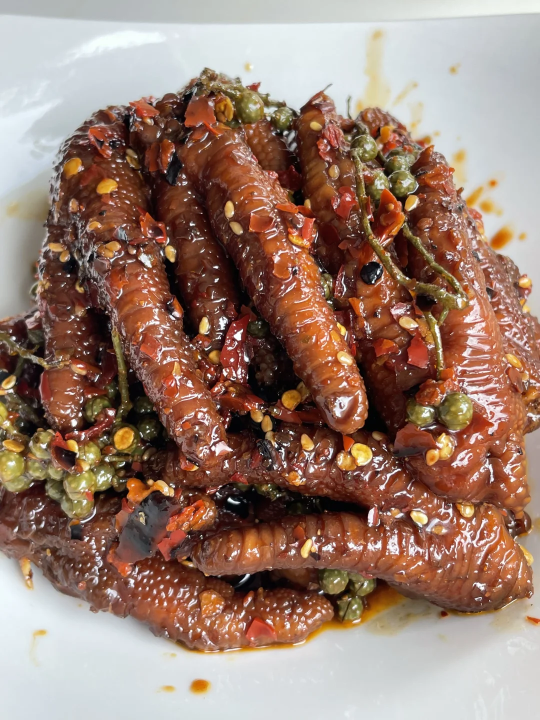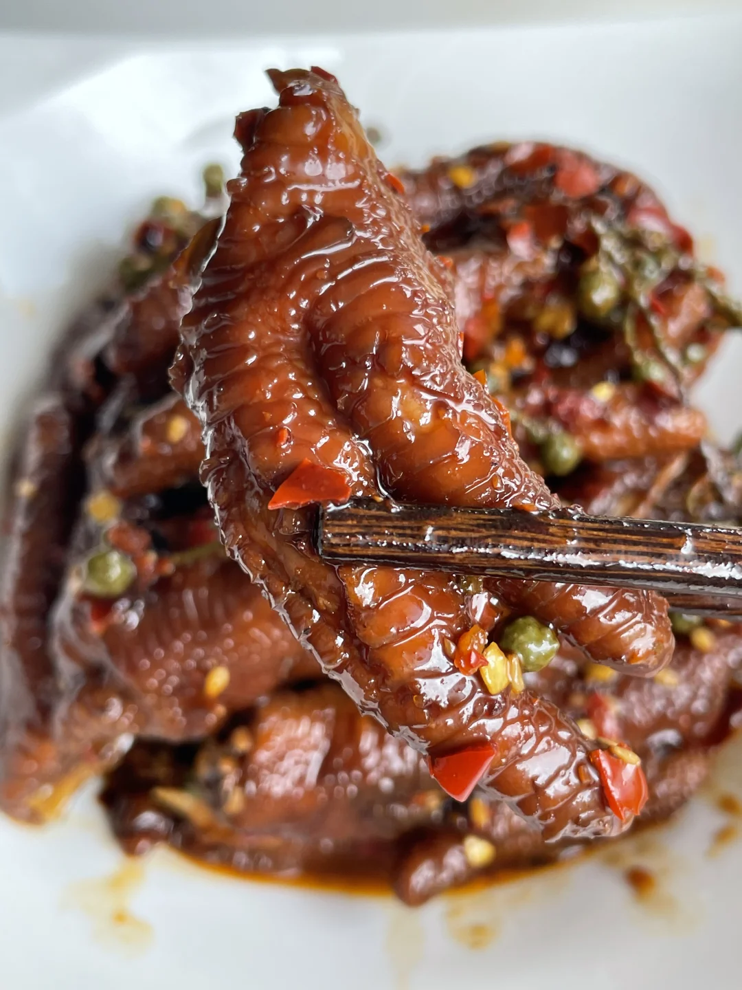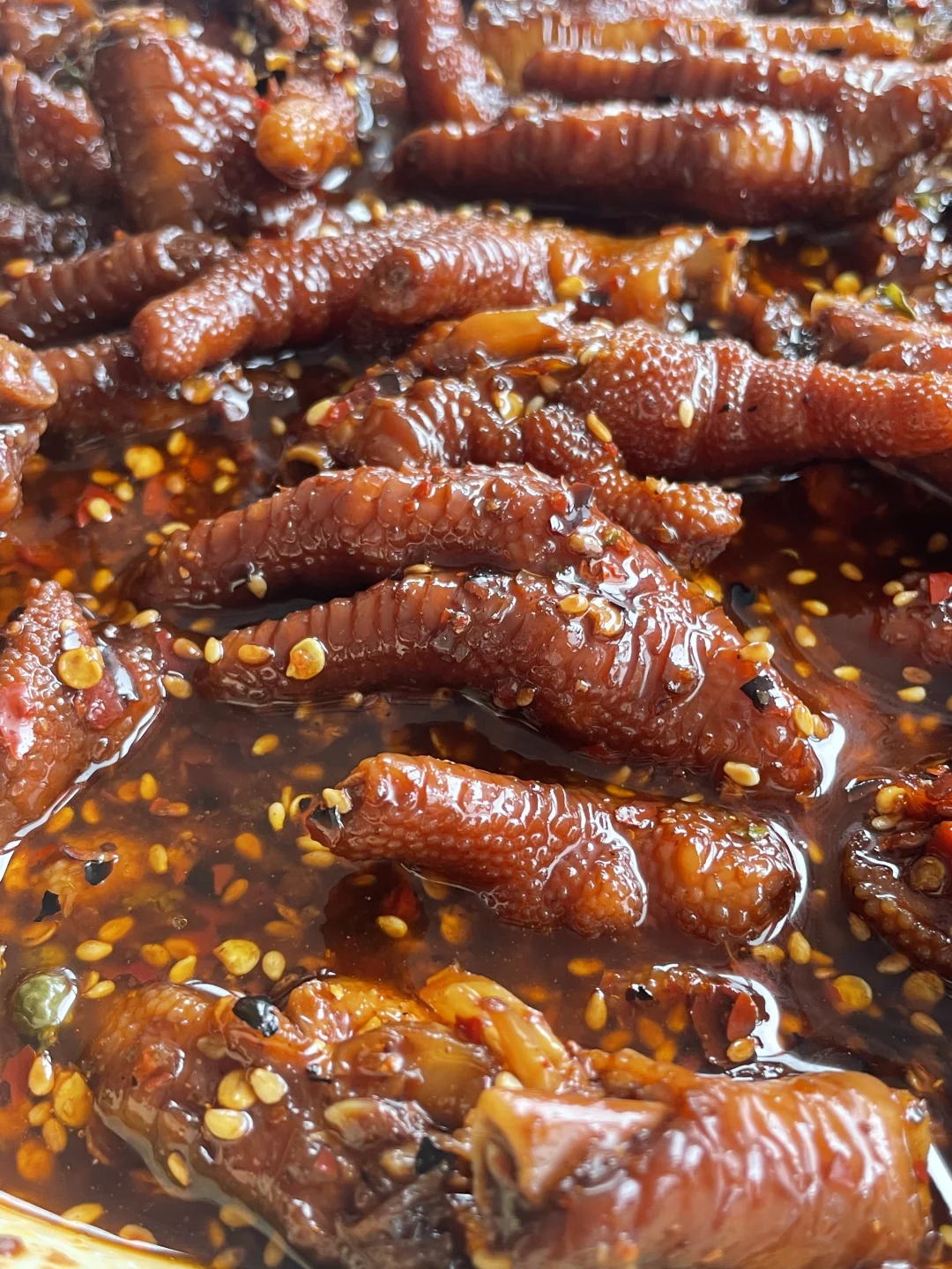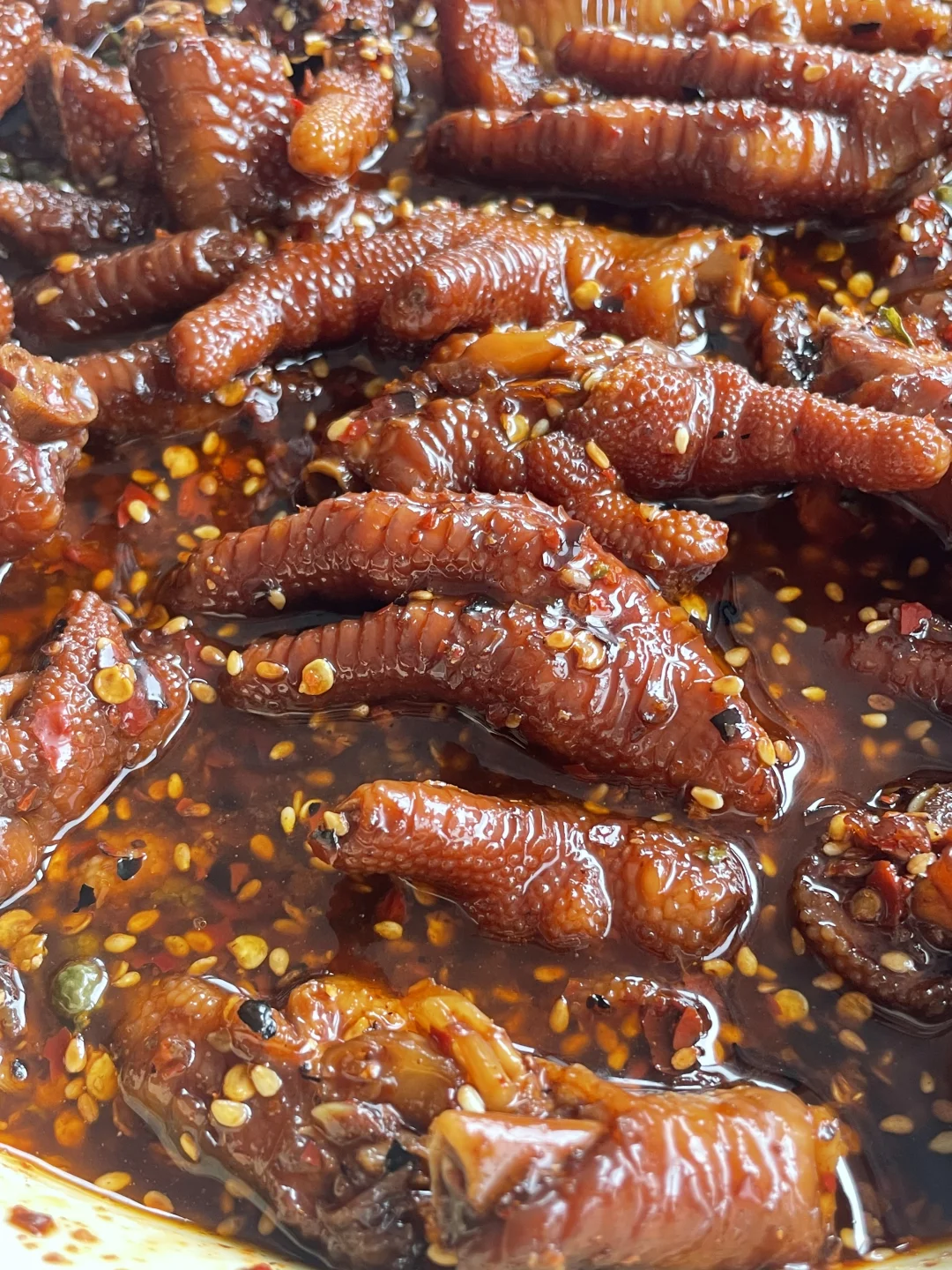 3⃣️鸡爪一分为二,冷水下锅,放入葱姜、料酒,水开打出浮沫,煮8分钟,捞出过凉水,将鸡爪控干水分,再放入刚才准备好的料汁中腌一晚。即可得到非常美味的糊辣壳鸡爪,做法是不是真的很简单,但是真的巨好啃[流泪],不管是看电视还是外出野餐都是不错的选择,喜欢的姐妹可以尝试做一做。