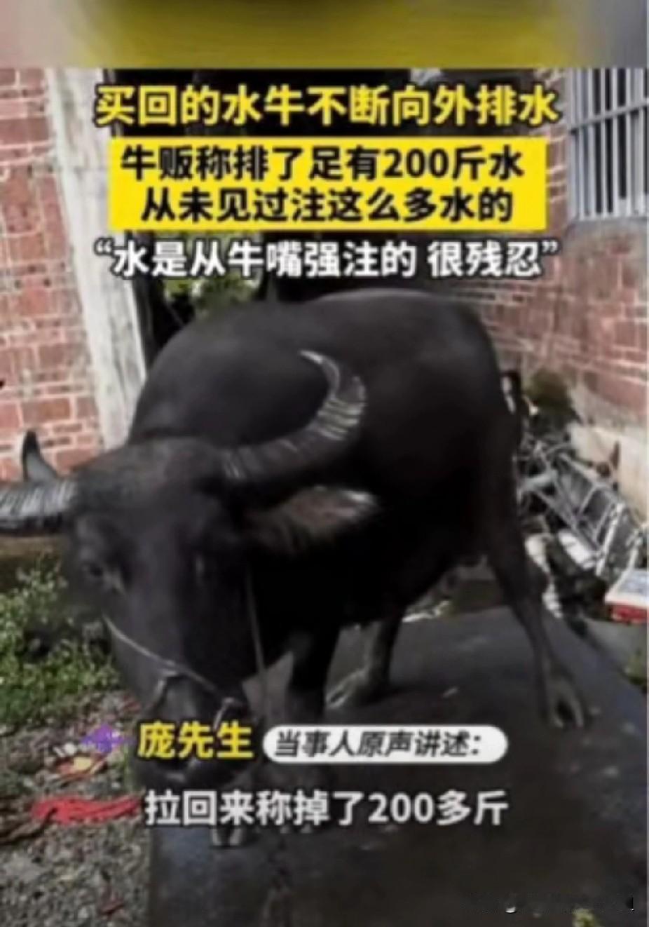 太残忍了。广西钦州,庞先生买了一头牛,回家以后这头牛就开始不断的排水,原本圆圆鼓鼓的大肚子都瘪了下去。最后上称发现排出去了足足200斤的水。 这头牛经历的一切,背后藏着一条残忍的产业链。牛贩子们为了多赚几千块钱,会用两米长的硬管子直接插进牛的嘴里强行灌水,每头牛都要被灌进去将近50升。看着牛痛苦得直吐白沫,肚子撑得像皮球一样滚圆,这些商贩也毫不动容。这些被灌饱了水的牛,几小时内就会被送到正规屠宰场,挂上看似合法的检疫证明,然后流向我们常去的菜市场、超市,甚至是一些单位食堂的餐桌。 这种注水牛肉坑的可不光是我们的钱包,更是直接威胁健康。国家规定的牛肉含水量标准是低于77%,但灌水肉远远超过这个指标。没经过消毒的水带着各种病菌渗进肉里,让肉更容易变质腐败,蛋白质也会流失。煮的时候锅里嗤嗤冒白沫,味道和营养都大打折扣。 更让人揪心的是牛承受的痛苦。它们被铁架子固定着,灌水时拼命挣扎,有的甚至受伤出血。动物在极度恐惧和痛苦下分泌的激素会留在体内,这样的肉怎么可能让人吃得安心?这种残忍的行为不仅不道德,已经触犯了法律。销售注水肉金额超过5万元就能定罪,最高可以判刑并处罚金。 普通人怎么才能避开这些注水肉呢?有个挺实用的方法:新鲜正常的牛肉颜色是深红的,用手按一下能很快恢复弹性,用纸巾贴上去不会湿透;而注水肉颜色发浅,摸起来手感湿滑,纸巾一沾就烂。下次买肉时多留个心眼,别让黑心商贩得逞。 从东莞到钦州,灌水牛的窝点一个个被端掉,说明社会容不下这种黑心买卖。我们消费者也得硬气起来,遇到问题肉立马举报,让监管链条彻底绷紧。毕竟每一口吃进嘴里的东西,都连着千万个家庭的平安。 各位读者你们怎么看?欢迎在评论区讨论。