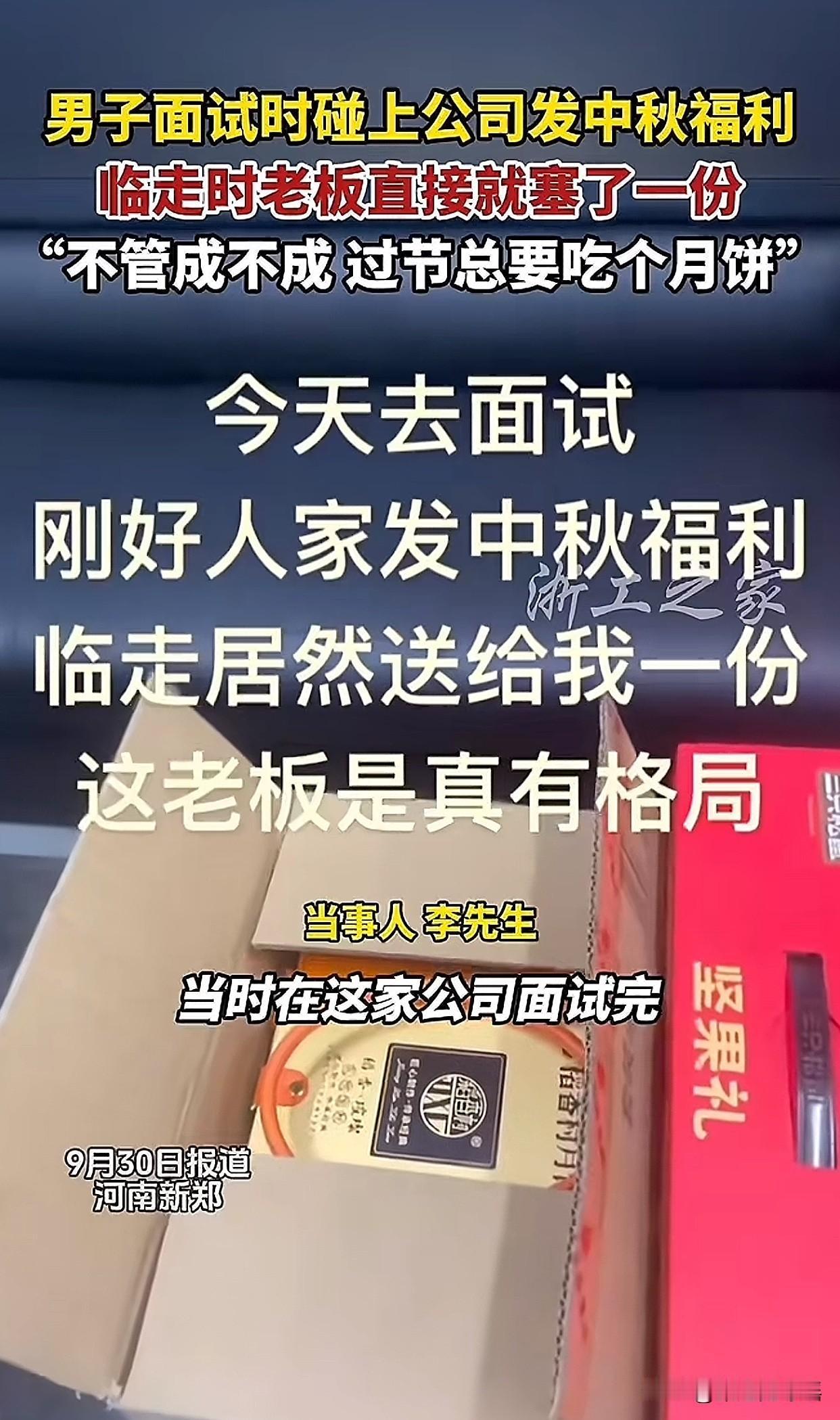“太暖心了!”河南一小伙面试不顺,临走时老板硬塞给他一盒月饼,还说“不管成不成,过节总要吃个月饼”。小伙当场被暖到了。 说实话,这哪是月饼啊,分明是份尊重。现在找工作不容易,用人单位常常高高在上,这位老板却能平等对待求职者,特别难得。 我觉得这事儿有个“暖心效应”,职场里的小善意会产生连锁反应。一盒月饼不值多少钱,但这份温暖能让求职者记很久。好公司招人,工资重要,但这种人情味更打动人。 真心觉得,能把善意当投资的老板才是真聪明。你想啊,对陌生人都这么体贴的公司,对员工能差吗?要我说,这样的老板,活该他成功!