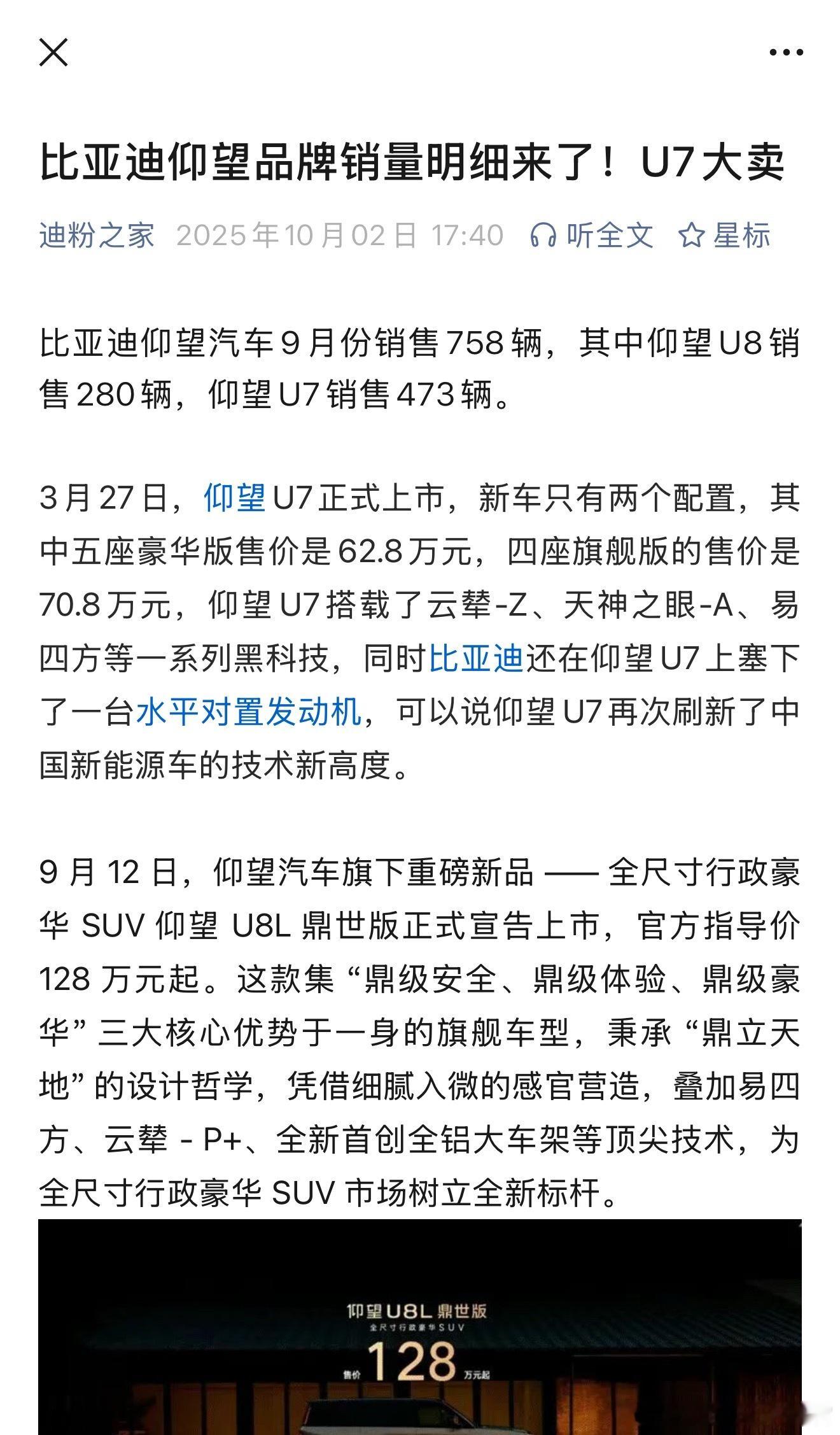 仰望U7这个销量可以啊[并不简单]果然还是得堆技术,不知道有没有机会重现当初U8的热销