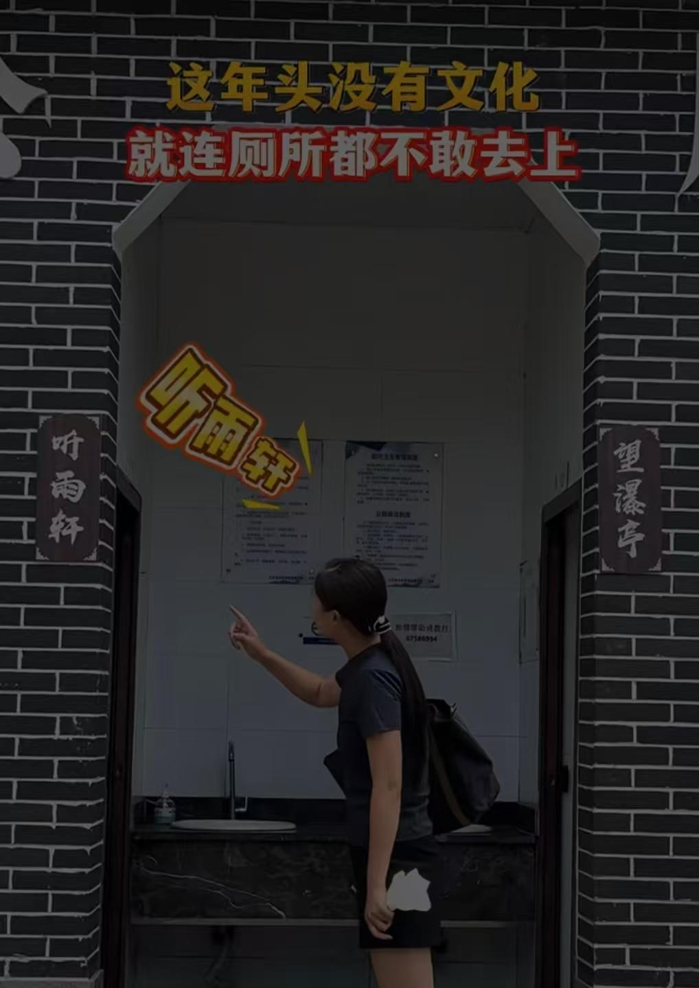 厕所直接写“男”和“女”,是犯法吗?女子,在路边着急上厕所,一路小跑到了厕所门口,结果却傻眼了。只见门口一个写着“听雨轩”,另一个写着“望瀑亭”。这女子心里那叫一个郁闷啊,本来内急就火烧眉毛了,还整这么复杂?这不是故意为难人嘛! 这俩牌子就跟猜谜语似的,别说是年轻人被绕得晕头转向,老人和孩子更是完全摸不着头脑。 这标识写了就跟没写一样,要么等里面的人出来瞧瞧是男是女,要么硬着头皮进去探个究竟。 要是女的误进男厕,情况还算稍微好点,顶多就是尴尬;可要是男的稀里糊涂进了女厕,那可就真成“事故”现场了,说不定还会被当成流氓,惹上一堆麻烦事儿。 事后,女子越想越气,把这事儿发到了网上,想问问广大网友到底哪个是男厕,哪个是女厕。 而网友们的回复那叫一个五花八门,让人看得哭笑不得。 有网友一本正经地分析说,男人站着尿,那声音“哗啦哗啦”的,就跟听雨似的,所以“听雨轩”是男厕;女人尿的时候口子大,那水流就像瀑布一样,所以“望瀑亭”是女厕。 还有网友反过来说“望瀑亭”是男厕,就好像站在高处望着下面的瀑布。“听雨轩”是女厕,只能听到声音却看不到雨水。 更奇葩的是,有网友出主意说,对着厕所里面喊一嗓子,要是男的回应,那就是男厕;要是女的回应,那就是女厕;要是没人回应,那就随便进一个。 看到这些回复,只能说明大家对这俩奇葩标识都是一头雾水,根本分辨不出来。 除了这种让人摸不着头脑的文字标识,还有一些公厕用抽象图案来区分男女,比如长颈鹿和大象。 这要是猜对了,就能顺利上厕所;可要是猜错了,那就要“上派出所”了。 公厕标识本就应该简单明了、通俗易懂,这是最基本的要求。可现在有些地方却为了追求所谓的“创意”“文化”,把标识搞得云里雾里! 这不仅给使用者带来了极大的不便,还可能引发一些不必要的尴尬和麻烦。 相关部门真该好好反思反思了,别让这些华而不实的标识成为大家上厕所的“拦路虎”。 公共设施的设计,首先要考虑的就是实用性,要以人为本,而不是为了标新立异而忽略了最基本的功能。 不然,这样的“创意”只会成为大家茶余饭后的笑料,而无法真正得到认可和推广!