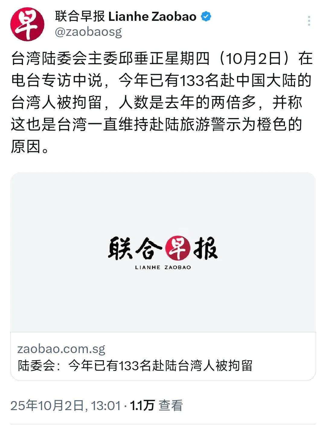 外媒10月2日报道, 会主委邱垂正在电台专访中透露,今年已有133名 民众因涉及法律问题,在中国大陆遭拘留,人数超过去年两倍。 邱垂正特别提到,133人中,有“一贯道”信徒因涉嫌违反大陆刑法被捕,另有台籍女网红在泰国吸食 ,入境上海后尿检阳性遭拘。 这些案例实际上说明,大部分被拘的台胞并非无辜受难,而是因违法所致。 台当局却巧妙回避犯罪细节,只对外放大“赴陆风险”,借此维持橙色旅游警示级别。 会宣称预警理由,是为保护 人民安全,实际却明显带有管控意味,意图限制台胞前往大陆、构建刻板印象。 不少台青私下直言,这种封闭思维只会让大家更好奇真实的大陆,而所谓“软禁”,更像是一场没有悬念的闹剧。 到底是大陆风险高,还是自身行为有问题?你怎么看这样的“橙色警报”?