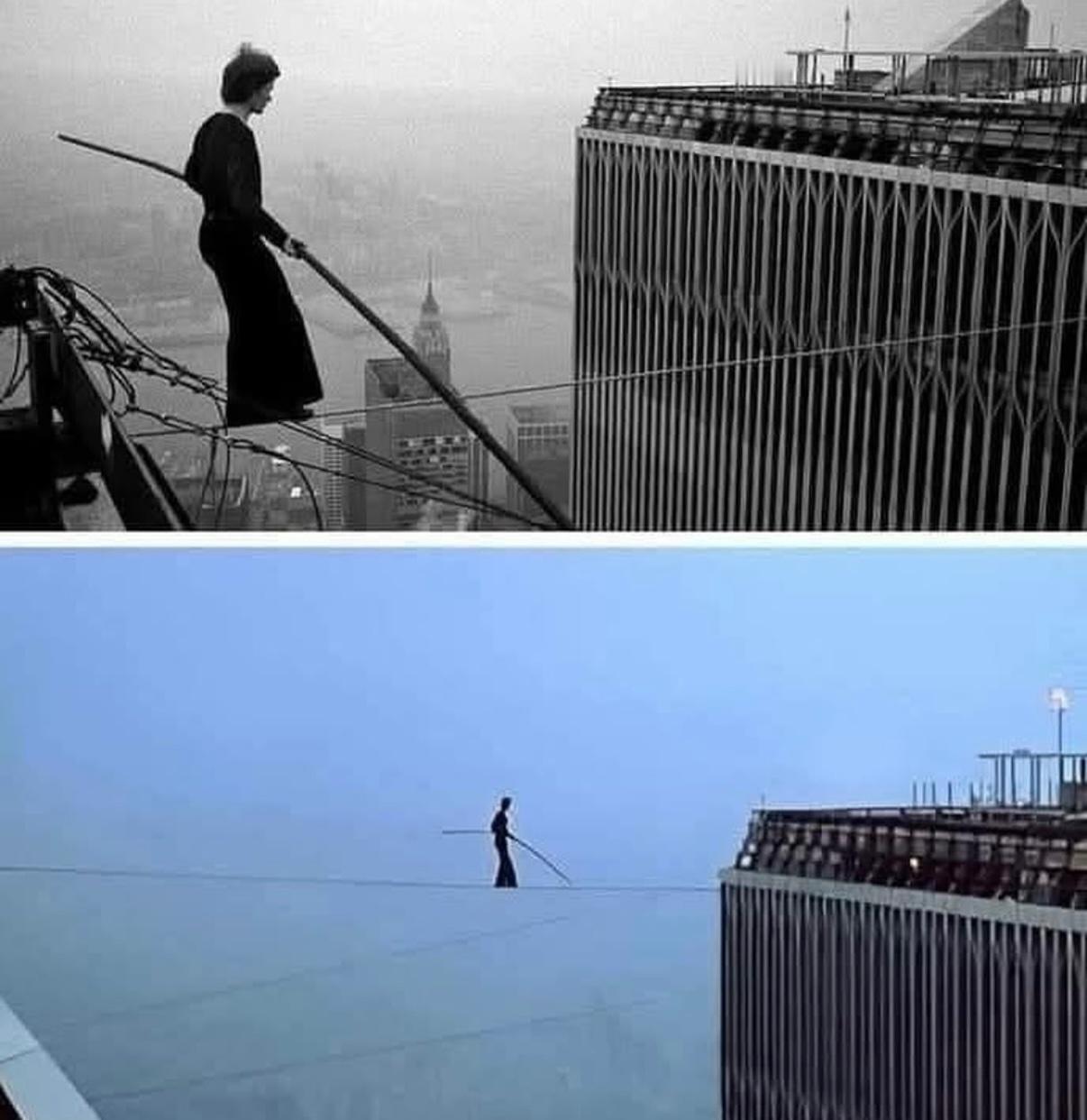 1974年8月7日,法国走钢丝表演者菲利普·珀蒂在纽约世贸中心双子塔之间表演了高