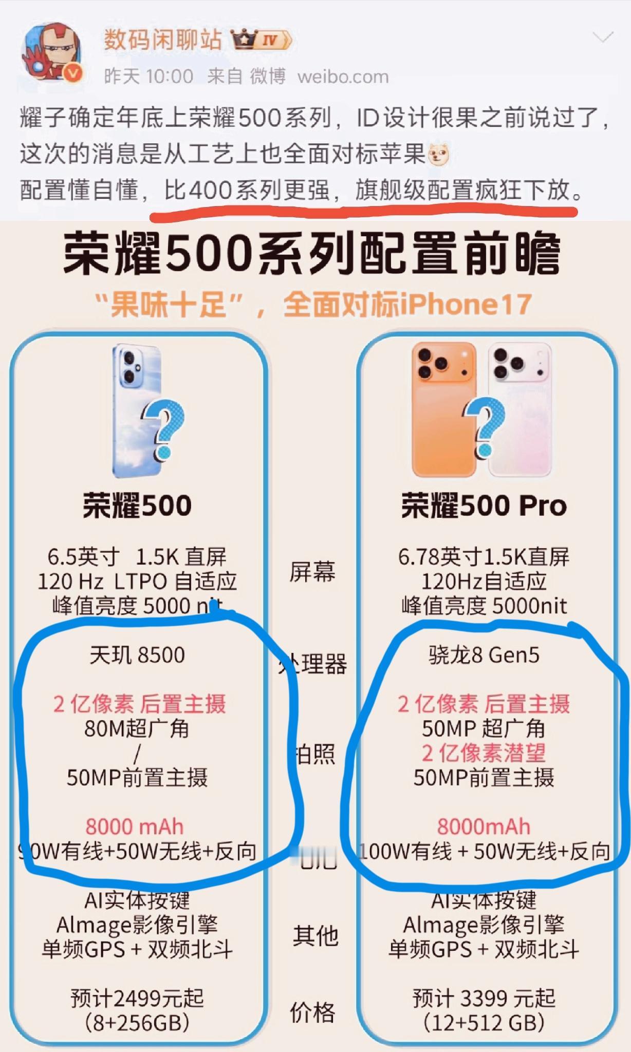 荣耀这是要掀桌子的节奏?荣耀400系列就让友商眼红了,没想到这次荣耀500系列升级幅度更大,配置堪比旗舰。 其实从具体配置升级来看,性能、影像和续航都是很明显的,值得一提的是,荣耀还使出了“杀手锏”,设计对标苹果,这谁顶得住?[笑哭]