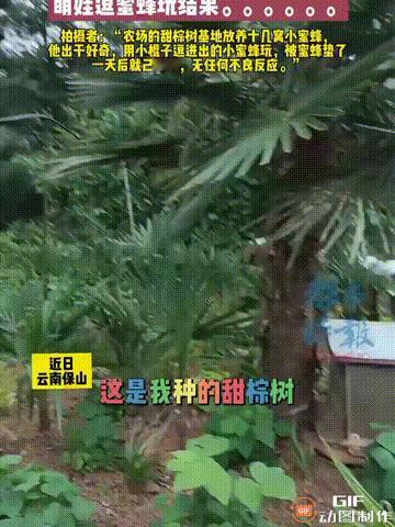 云南保山一处农场内,种了很多甜棕树,同时也放养了十几窝蜜蜂,谁料一个男孩出于好奇,居然用棍子挑逗蜜蜂,结果嘴巴被蜜蜂蛰了,直接就肿起来了,像“香肠嘴”一样,但男孩的心态很乐观,还表示不影响吃肉,网友看完这段视频,都觉得这个男孩真是太倒霉了,没想到会被蜜蜂蛰成这样,简直就像是电影《东成西就》里面梁朝伟饰演角色的香肠嘴,看起来也是很可怜了,不过这也是因为他比较调皮,所以才会导致被蛰,希望家长还是要多注意,尽量不要让孩子接触这些危险的小动物,以免发生意外。大家怎么看呢?