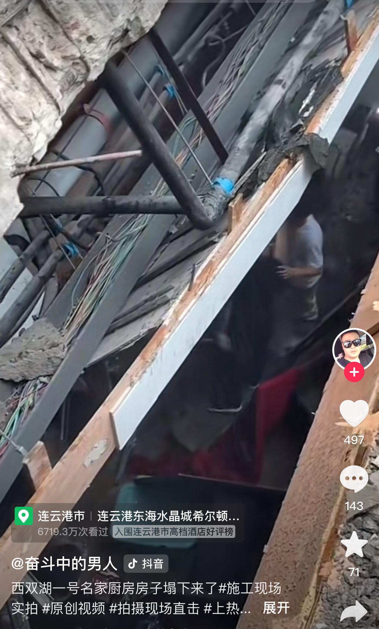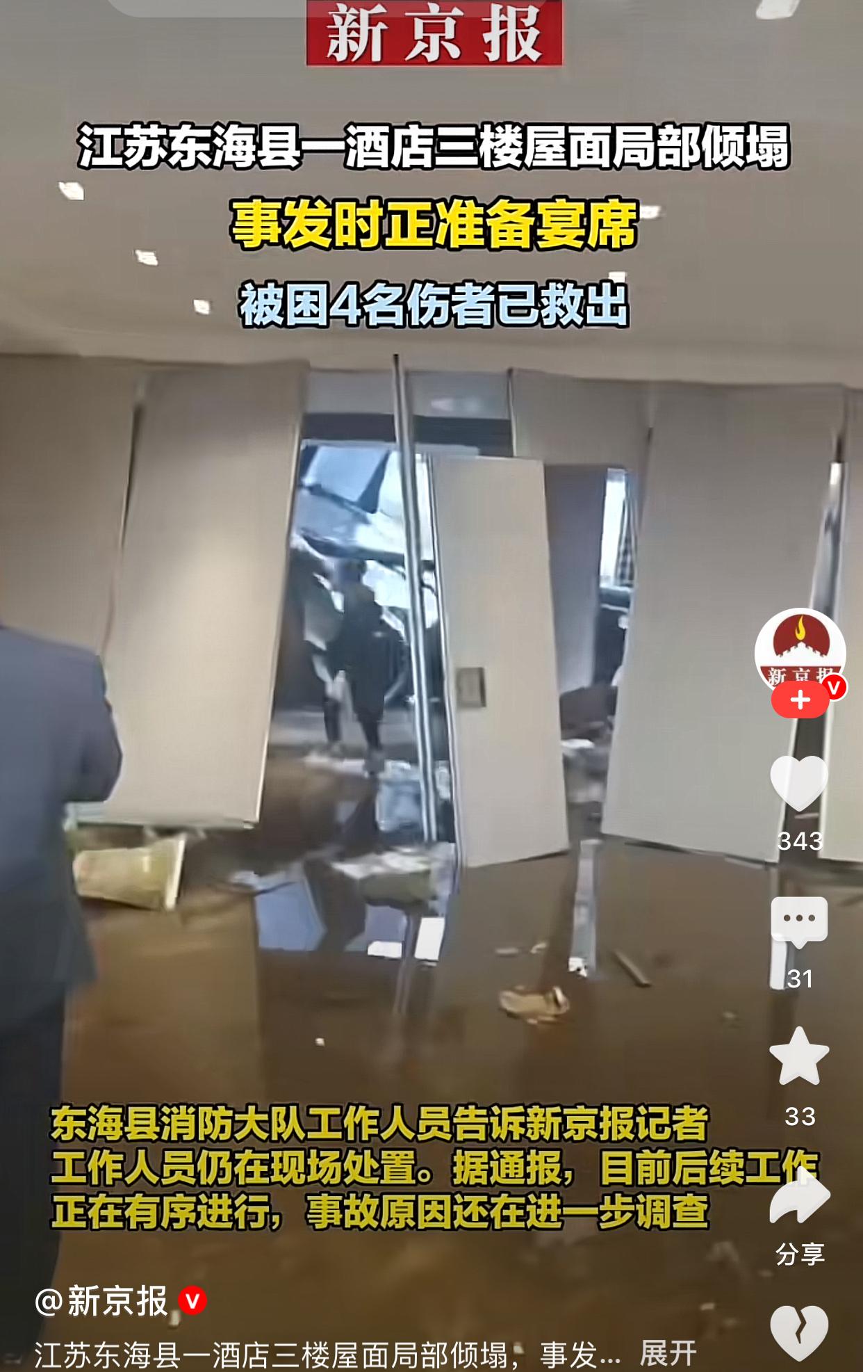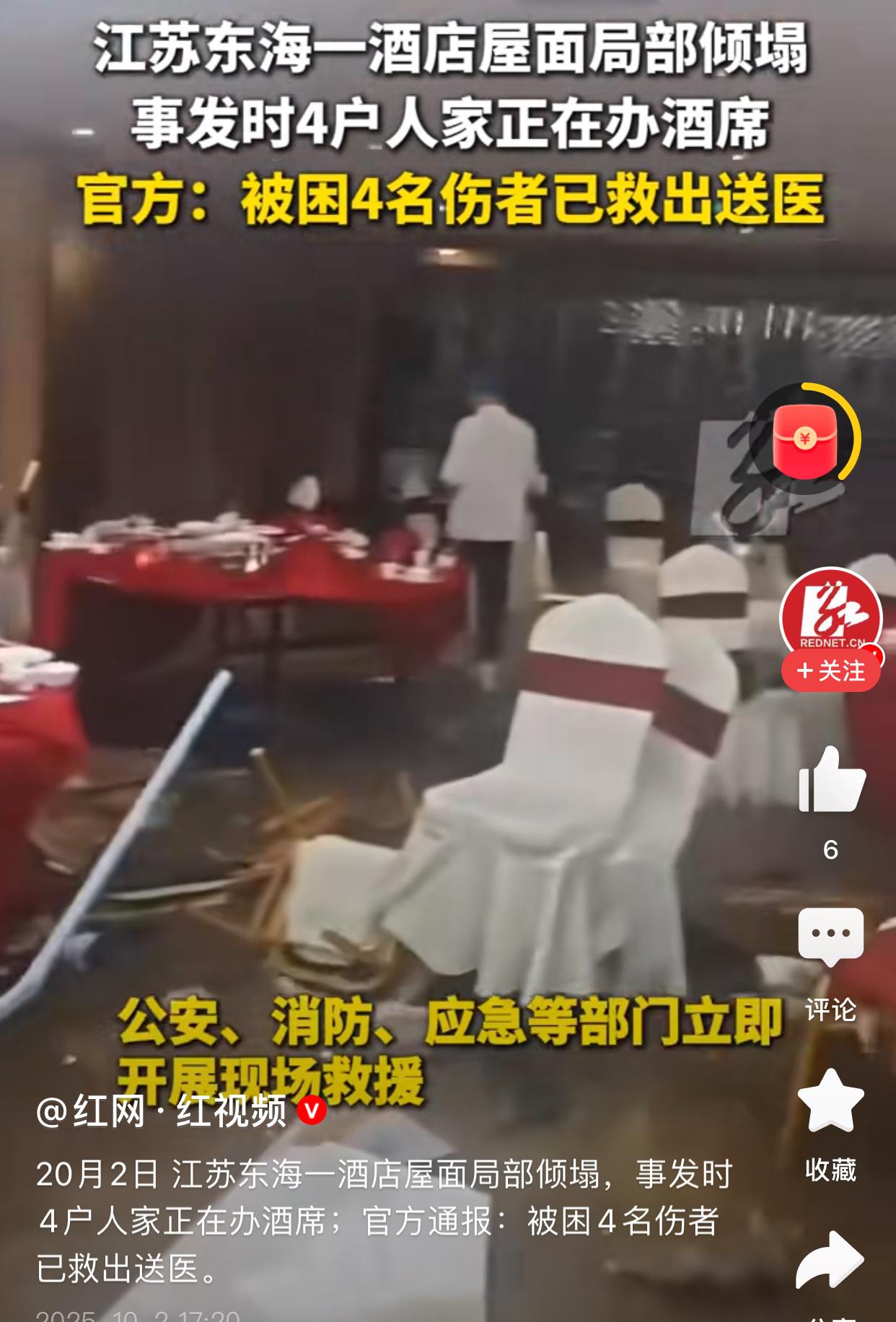 结婚宴席还没结束呢,酒店塌了!!! 谁遇到这事不得闹心一辈子,这婚算结成了还是没成呢?再办一次要不要收礼金呢? 连云港东海县的名家厨房22年改装了三楼的宴会厅,号称无柱无死角,最多容纳46桌,确实好地方,够排场,但是这安全性也太差了,不到三年屋顶就塌了,太吓人了 倒塌的时候还下着大雨,好多人都弄的很狼狈,还好人没事,被困的四个人下午就救出来了。 这下十倍赔偿多不多?