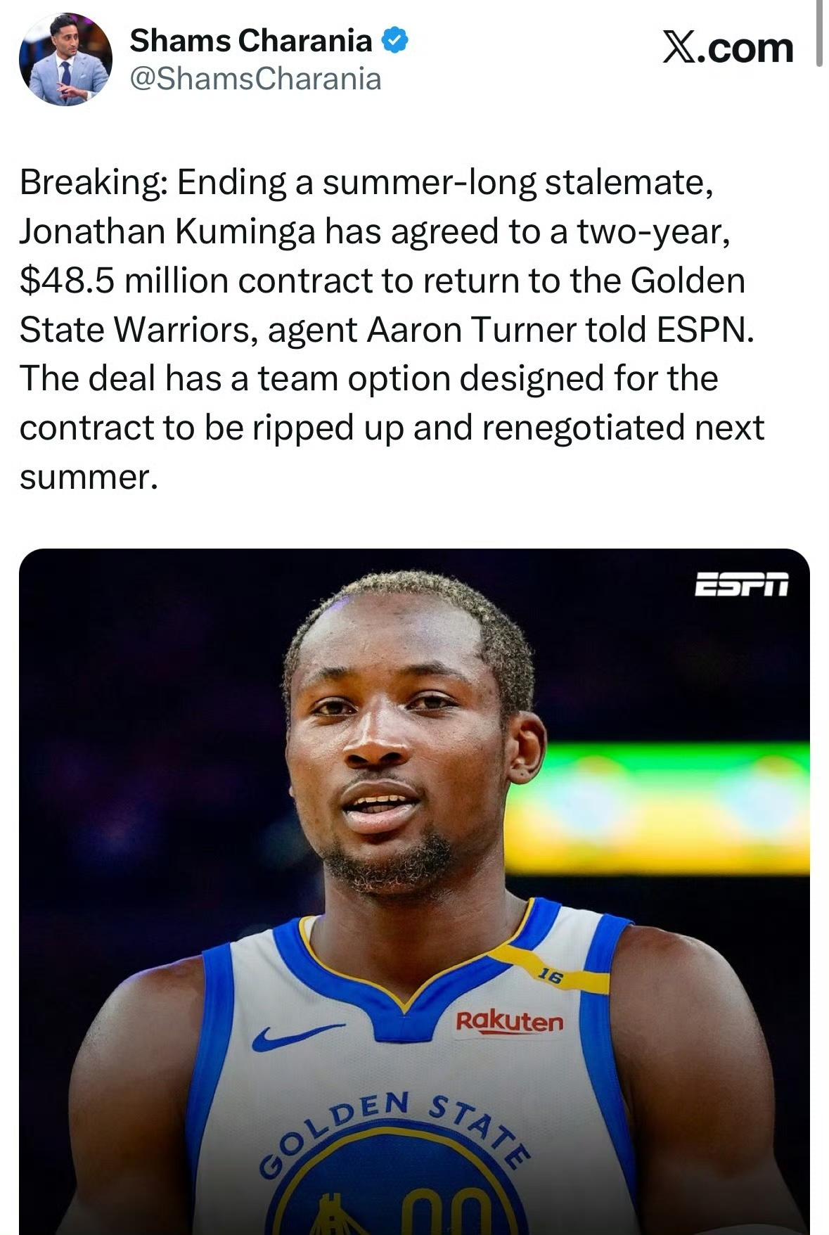 库明加输了面子没输里子! 今年休赛期最大的瓜随着新赛季即将拉开帷幕终于落地,库明加最后选择了两年4850万的球队选项,看起来他似乎进行了妥协,没有像小托马斯和格兰姆斯那样硬刚,但其实这更像是经纪人极限施压后的结果,输了面子但没输里子! 1.虽然一开始索要3000万的年均薪,但参考吉迪的合同后相信库明加团队已经有了清醒的认识,该份报价年薪上与2500万的心理价位相差无几。 2.所谓的球队选项无非就是去留的主动权,并不代表第二年无保障,不管是勇士还是其它寻求交易得到他的球队都不可能在明年休赛期放弃这个选项,除非提前续约。 3.这份合同与790万的资质价格比起来区别还是很大的,赌一年伴随着伤病与使用率的风险毫无意义,双方大概率已达成默契,勇士会继续寻找合适的下家,将库明加送到他认为能对其职业生涯发展更好的球队。 现在的结果从库明加的表情就能看出来,他应该是满意的,所以这事没有服不服软,只是经纪人的手段比较极端,导致球队引援承受了相当大的压力,当然对勇士来讲也算不错的结果。根据shams报道勇士将在库明加的交易冷冻期结束后立即探索他的交易,他们避免了白白失去这位年轻人,同时还掌握了交易主动权。随着霍福德、赛斯库里、梅尔顿等人的陆续签约,勇士休赛期的引援工作算是压轴完成,库明加也已飞回湾区,将参加球队新赛季的首次合练,接下来就是重要的磨合期了,各位认为这支平均年龄偏大的勇士新赛季还能否带来惊喜呢?