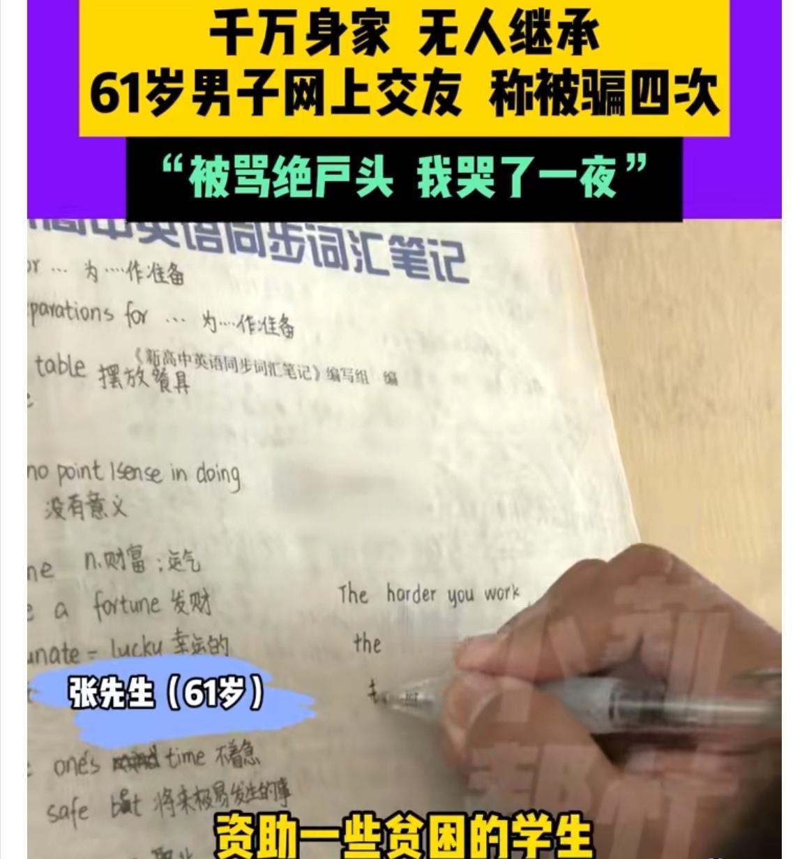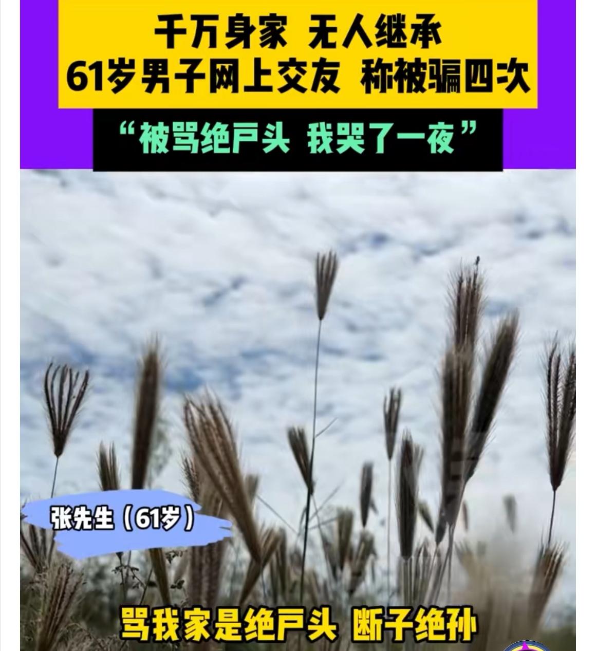 【千万身家三套房,河南61岁张先生却为“后继无人”苦恼至哭泣】 61岁的张先生,本是别人眼中的“人生赢家”:手握千万资产、事业编制、200万存款,还拥有四套房产,其中一套还在深圳这样的黄金地段。可这样的条件,却没有给他带来想象中的幸福——因为没有孩子,他竟然被人嘲讽为“绝户”,难过得连夜痛哭,内心的孤独和无奈可想而知。 其实,张先生的人生并不容易。小时候家境贫寒,奶奶是盲人,还常常抱着他一起沿街乞讨。他靠着咬牙读书、拼命努力,才从最底层一步步逆转命运。成年后经历离婚,单身多年,想通过网络交友寻觅真情,却屡屡遭遇骗局,已经被骗了四次。这让他对网络世界既无奈又失望。 如今,这位身家丰厚的大叔最大的心愿,就是找一个真心陪伴他的伴侣,“不仅是结婚,也是希望财产有人继承、人生有人陪伴”。但现实远比想象复杂,一个人再富有,生活的温度和归属感很难用钱换来。张先生的故事也提醒更多人,财富虽好,孤独却难解,深夜哭泣不是“绝户”的错,而是真情太难寻。 对于上了年纪又经济充裕的单身人士,如何在 事业 、情感和安全间找到平衡,确实该是社会和平台都关注的话题。网友们也纷纷呼吁:愿好人能遇到好人,不要让人品和财富再成为悲剧的筹码。