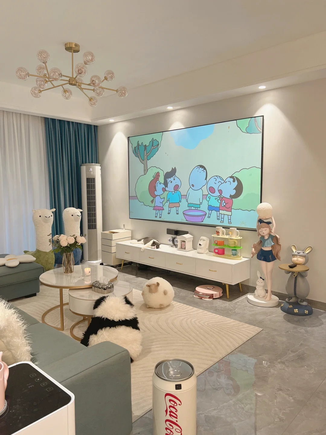 硬装尽量简单,不做复杂电视背景墙。放上一块110寸的投影幕布,省钱又耐看,色调统一还显得空间大,越简单硬装越是包容性强,充满无限可能,后期想换风格只需要换换软装即可,完全不会有违和感~