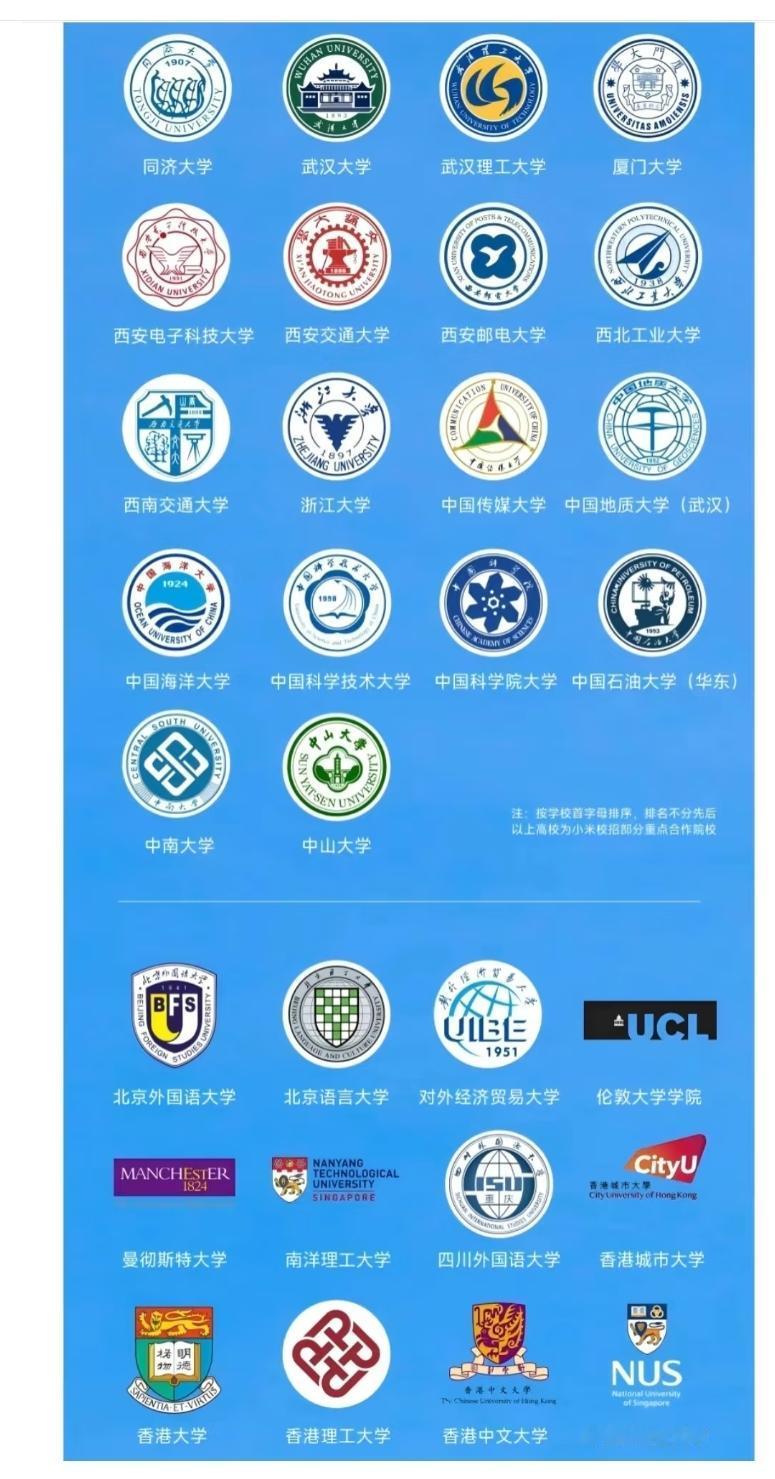小米致谢65所大学,这阵容里有你的母校吗? 小米这波操作太有诚意了!直接把65所大学的校徽列出来致谢,放眼一看,清北复交、浙大武大这些国内顶尖名校全在列,还有曼彻斯特大学、伦敦大学学院这些海外知名学府,这阵容也太豪华了。 湖南的小伙伴可以自豪一下,湖南大学和中南大学双双上榜!湖大的机械、土木,中南的冶金、医学,都是各自领域的强手,小米的产业链里肯定少不了这两所高校的人才和技术支持。 再看看其他学校,北京的北大、北航、北理工,上海的复旦、上交,江苏的南大、东南大学,广东的华工、电子科大……简直是把全国的优质高校资源都“一网打尽”了。还有海外的南洋理工、新加坡国立大学,国际化布局也很明显。 这些高校在科研、人才培养上的实力有目共睹,小米能和这么多高校深度合作,不管是在芯片研发、人工智能,还是新材料、通信技术领域,肯定能碰撞出不少火花。这也说明企业和高校的产学研结合越来越紧密,高校的学术成果能更快地转化为实际产品,企业也能获得源源不断的创新动力。 看着这么多熟悉的校徽,是不是瞬间勾起了校园回忆?从这些学校走出来的学子,在小米的各个岗位上发光发热,推动着科技产品的迭代升级。 你母校在这份名单里吗?你觉得高校和企业的合作,还能在哪些领域擦出更多惊喜?来聊聊你的想法~小米公司 雷军武大 小米集团文化 小米商标 武大校徽 雷军武大凡尔赛 武大雷军奖学金