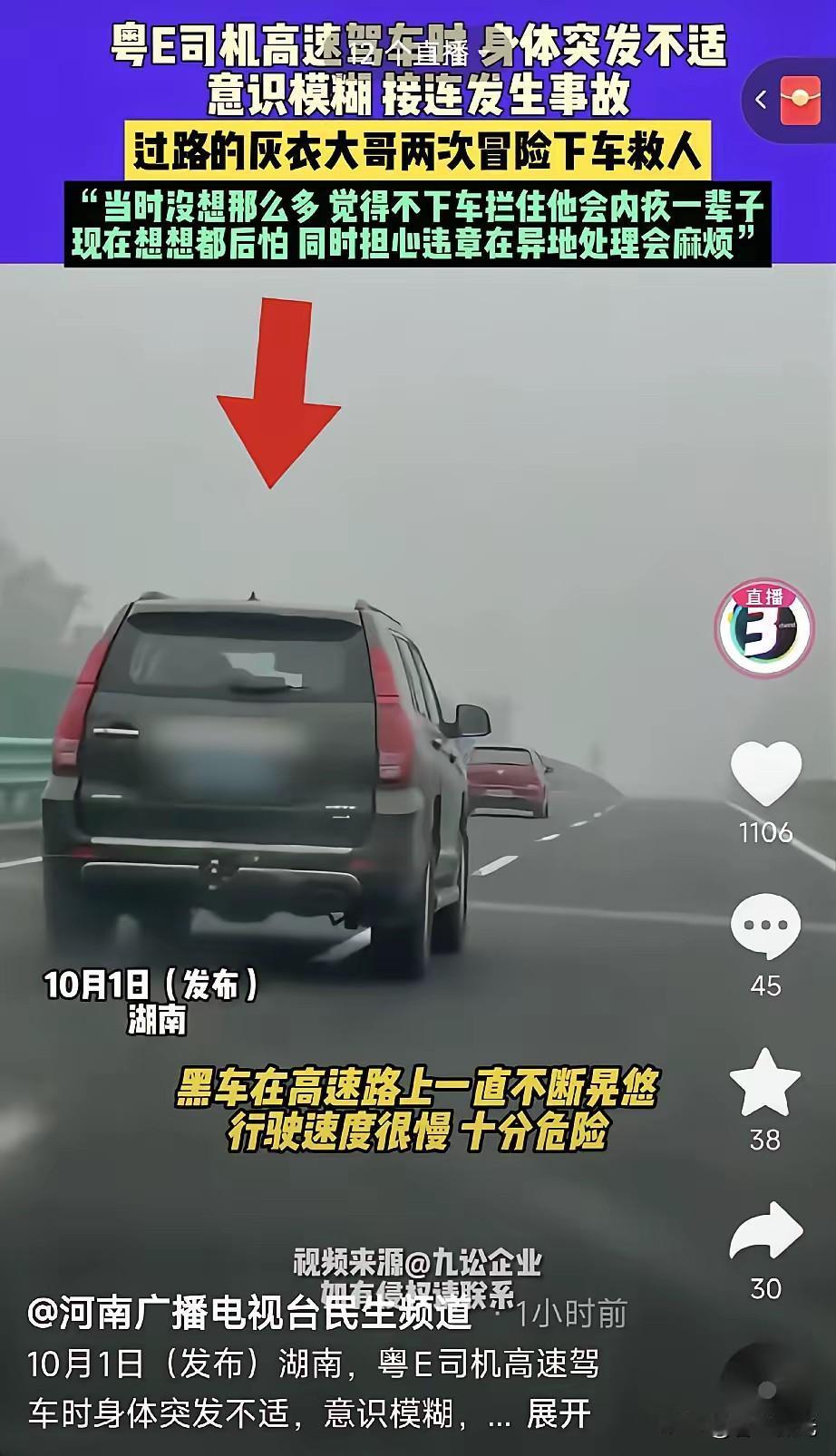 太危险了!湖南,中秋国庆假期,一男子开车带着老婆孩子还有妈妈从武汉回长沙老家过节,就在快到长沙时,却看到前面有一辆黑车车速很慢而且左右晃悠,情况十分危险。 这时,后面的车也都陆续追上来,按喇叭提醒,黑车也没有任何反应。 男子意识到不对劲,就加速与黑车并行,却发现黑车司机头部歪倒一侧,好像失去意识,再按喇叭仍然没有反应,之后就一直跟着黑车低速行驶并打开双闪。 中途,男子做了一个大胆的举动,将车停在应急车道,随后立即跑去拉黑车车门,但车仍然继续往前开,所以车门打不开,男子只能返回自己的车继续跟着。 车里的老婆紧紧抱着后座的孩子,声音发颤地对着后视镜喊:“老陈,你慢点,别跟太近!”老陈没回头,眼睛死死盯着前方黑车的尾灯,那两盏红灯在车流里忽左忽右,像个醉汉的脚步。他腾出一只手摸出手机,让老婆赶紧打122报警,“跟交警说清楚位置,长沙绕城高速往雨花区方向,黑车大概是辆本田雅阁,车牌号我再凑近看看。” 中秋的阳光还带着点燥热,风从车窗灌进来,老陈额角的汗却凉飕飕的。他想起出发前妈妈在副驾念叨,说国庆路上车多,一定要慢点开,现在倒好,自己没慢,前头却出了这档子事。他慢慢把车往黑车右侧挪了挪,尽量挡住旁边车道的来车,双闪灯在车身上打出急促的光斑,后面的车大概也看出了异常,原本此起彼伏的喇叭声渐渐停了,几辆车默契地跟在老陈身后,形成一道松散的“保护圈”。 突然,黑车猛地往左侧偏了一下,差点撞上中央护栏。老陈心一紧,猛踩油门追上去,对着黑车的车窗大喊:“师傅!醒醒!”可驾驶座上的人还是歪着头,左手垂在身侧,一点动静都没有。他想起刚才拉车门的瞬间,透过车窗瞥见司机脸色发白,嘴唇干裂,说不定是突发了什么急病。 这时候老婆的电话挂了,带着哭腔说交警已经联系了前方的巡逻车,让尽量保持车距,别强行拦车。老陈深吸一口气,他知道急不得,要是自己操作不当,不仅救不了人,还得把老婆孩子和老妈都搭进去。他打开车窗,冲着后面一辆SUV比划手势,示意对方帮忙从左侧稳住黑车,那车的司机点了点头,慢慢跟了上来。 两辆车一左一右护着黑车,像护送一个随时会摔倒的老人。就这样走了大概两公里,远处终于传来了警笛声。巡逻车很快赶过来,交警拿着扩音喇叭指挥交通,还有人拿着工具试图破窗。老陈这才松了口气,把车停到应急车道,下去的时候腿都有点软。 后来从交警那里听说,黑车司机是突发低血糖晕倒了,幸好送医及时,没什么大碍。老陈回家跟亲戚说起这事,有人说他胆子大,万一出事怎么办,也有人说他做得对,换谁看着一条人命在眼前晃悠,都不能袖手旁观。其实老陈当时没多想别的,就觉得那车里说不定也有等着回家过节的家人,要是司机真出了意外,又是一个家庭的遗憾。 节假日的高速路上,每个人都揣着回家的期待,可意外从来不会挑日子。老陈的举动算不上多伟大,就是普通人在看到别人身陷险境时,本能地伸出了手。这种本能,比路上的车流量更密集,比节日的烟花更暖人——它藏在每一个赶路者的心里,在需要的时候,就能变成守护彼此的力量。 各位读者你们怎么看?欢迎在评论区讨论。