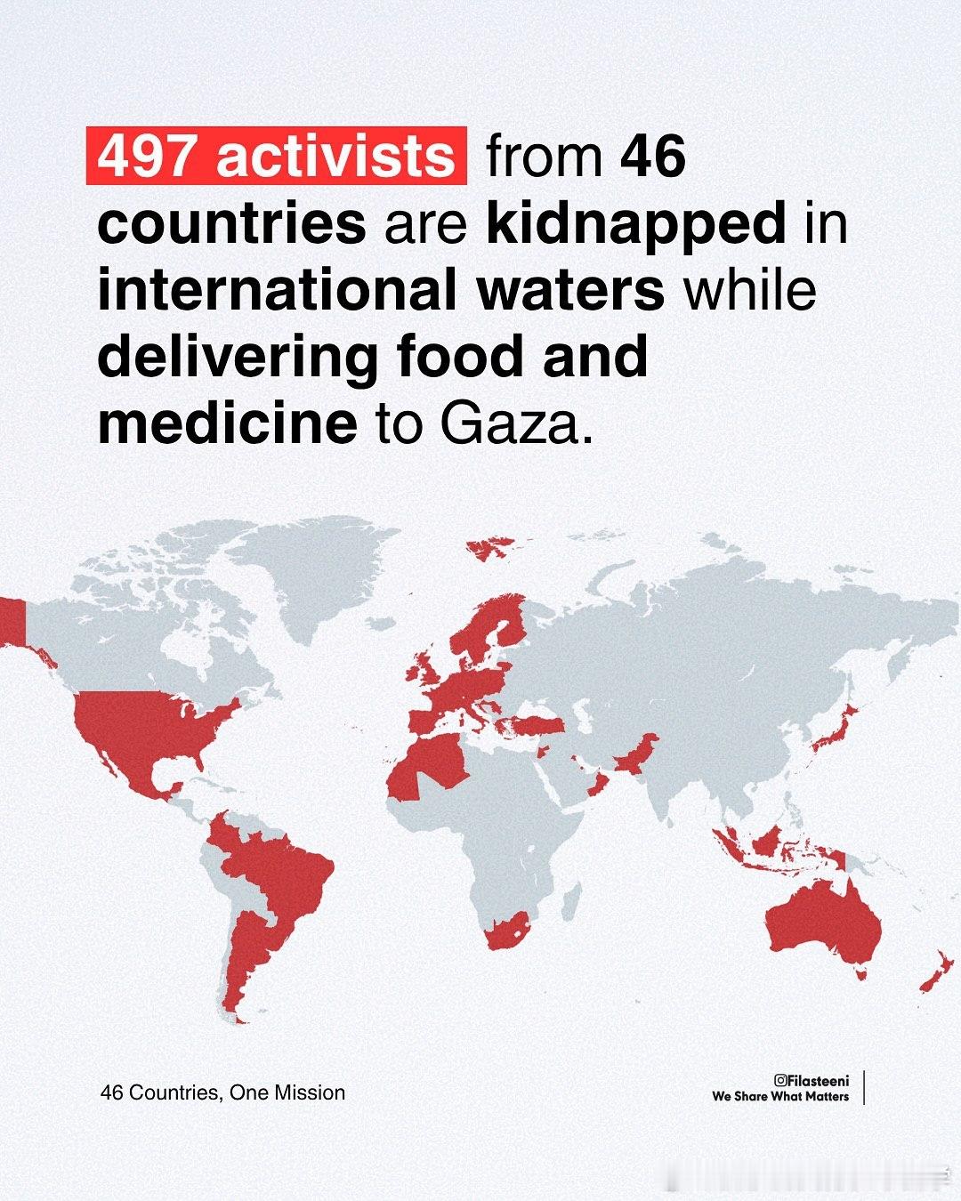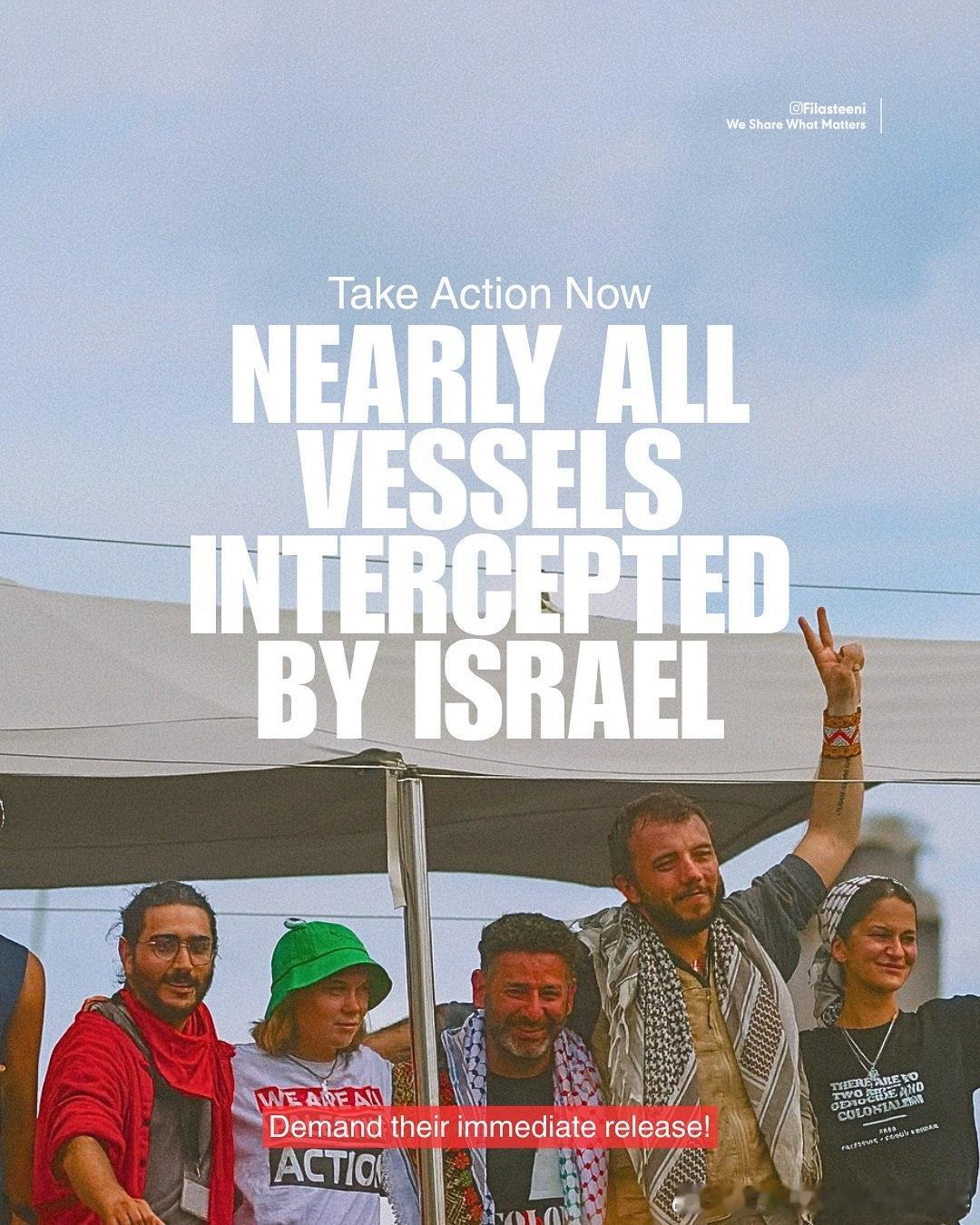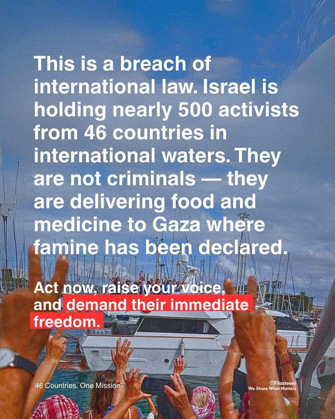 以色列正在国际水域一艘接一艘地扣押加沙救援船队。来自46个国家的近500名活动人士因为向饥饿的加沙运送食物和药品而被劫持。立即要求释放他们。