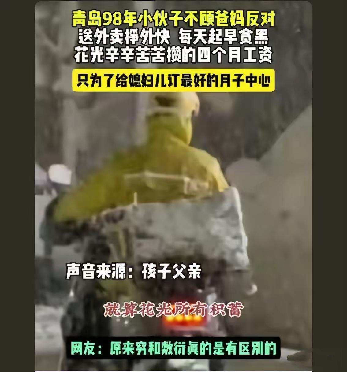 谁再说现在的年轻人没担当?青岛这98年小伙直接用行动打了所有人的脸! 为了给刚生产的媳妇订最好的月子中心,他愣是跟父母据理力争,接着起早贪黑扎进外卖大军里。四个月风吹日晒,衣服湿了又干,饭都顾不上按时吃,把所有积蓄全砸在了媳妇身上。有人说他傻,他却笑着说:“媳妇生孩子遭的罪,比我送外卖苦一百倍,她的身体才是最金贵的。” 其实哪有什么傻,不过是把老婆的付出看在眼里、疼在心里。现在太多人把“爱”挂在嘴边,可真正的爱从来不是甜言蜜语,而是像他这样,愿意把辛苦扛在肩上,把最好的都给对方。这种藏在烟火气里的担当,比任何浪漫都让人觉得踏实。 你们身边有没有这样用行动疼人的另一半?来评论区说说他们的故事吧!