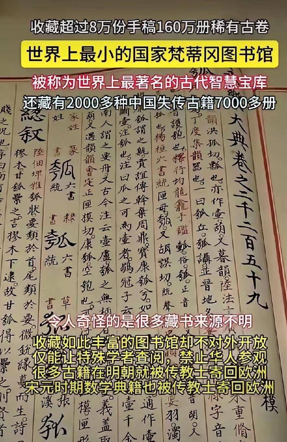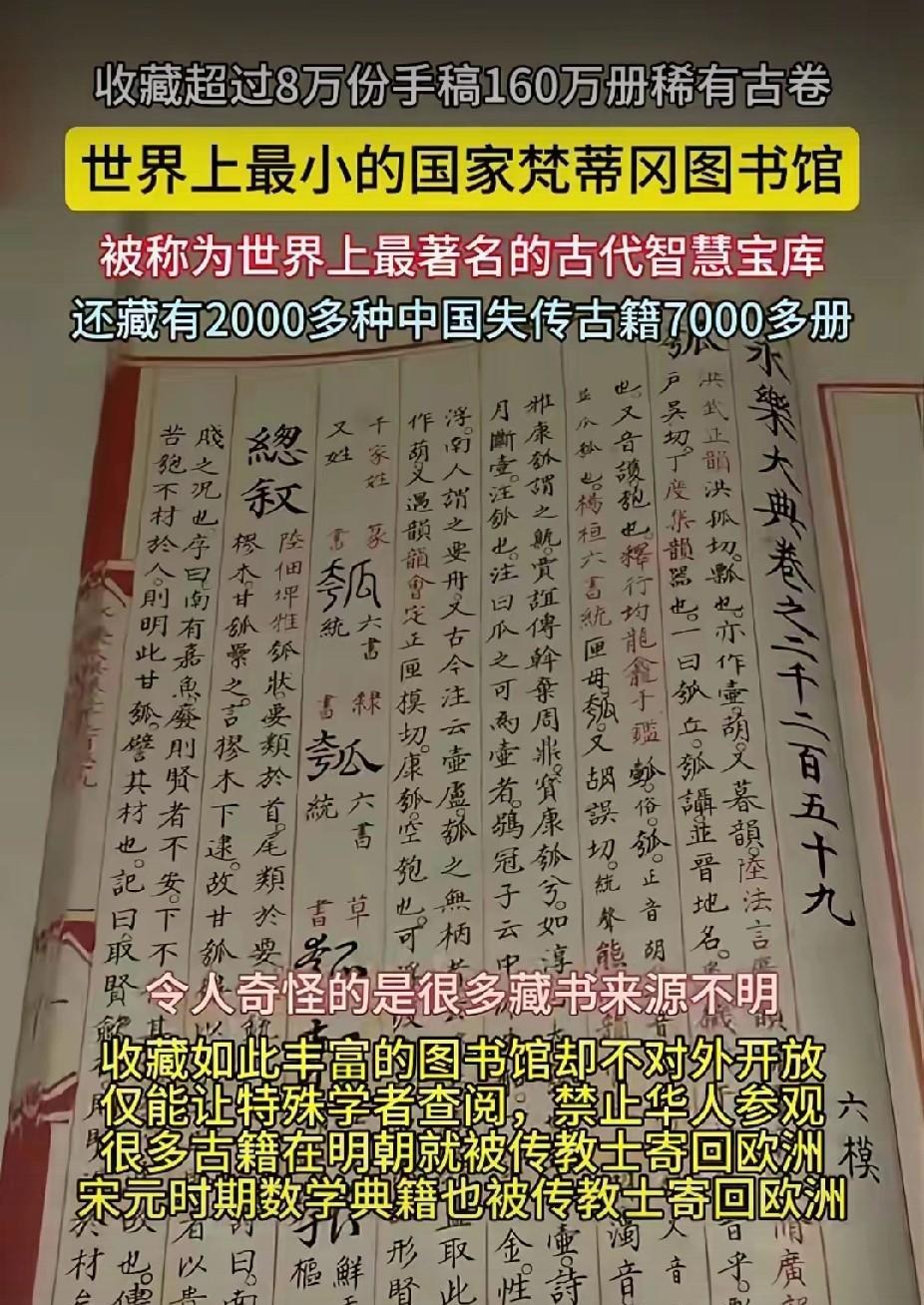 全世界最小的国家,梵蒂冈,面积还没有北京天安门大,却存有中国失传古籍7000多册,很多藏书不公开且来源不明 梵蒂冈,面积只有0.44平方公里,和天安门大小差不多,换个对比方式,它甚至可能都不如你家小区大。 全国只有800多人口。 就是这样芝麻大的地方,却占有着我国很多失传古籍,而且,不对外公开。 终有一天, 我们会光明正大的拿回我们失去的东西。