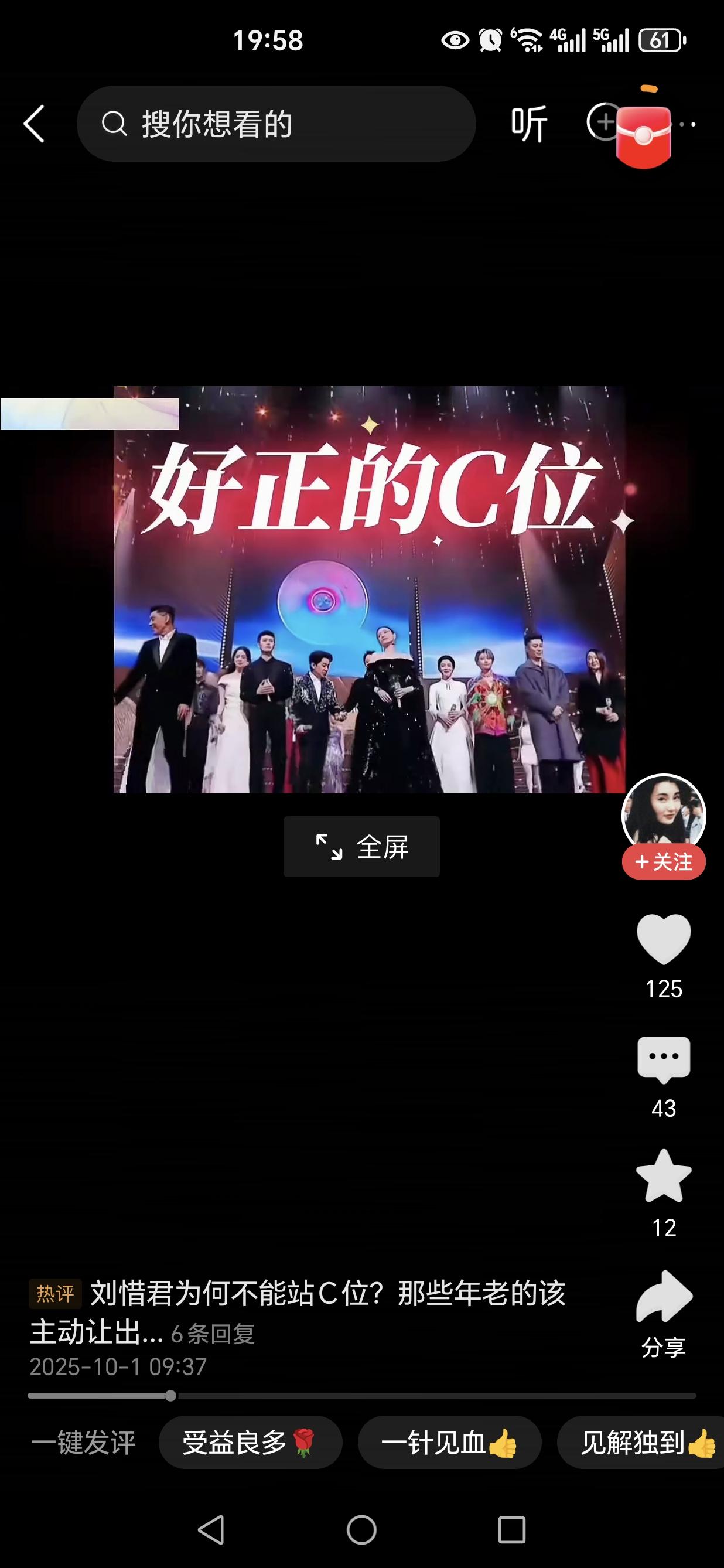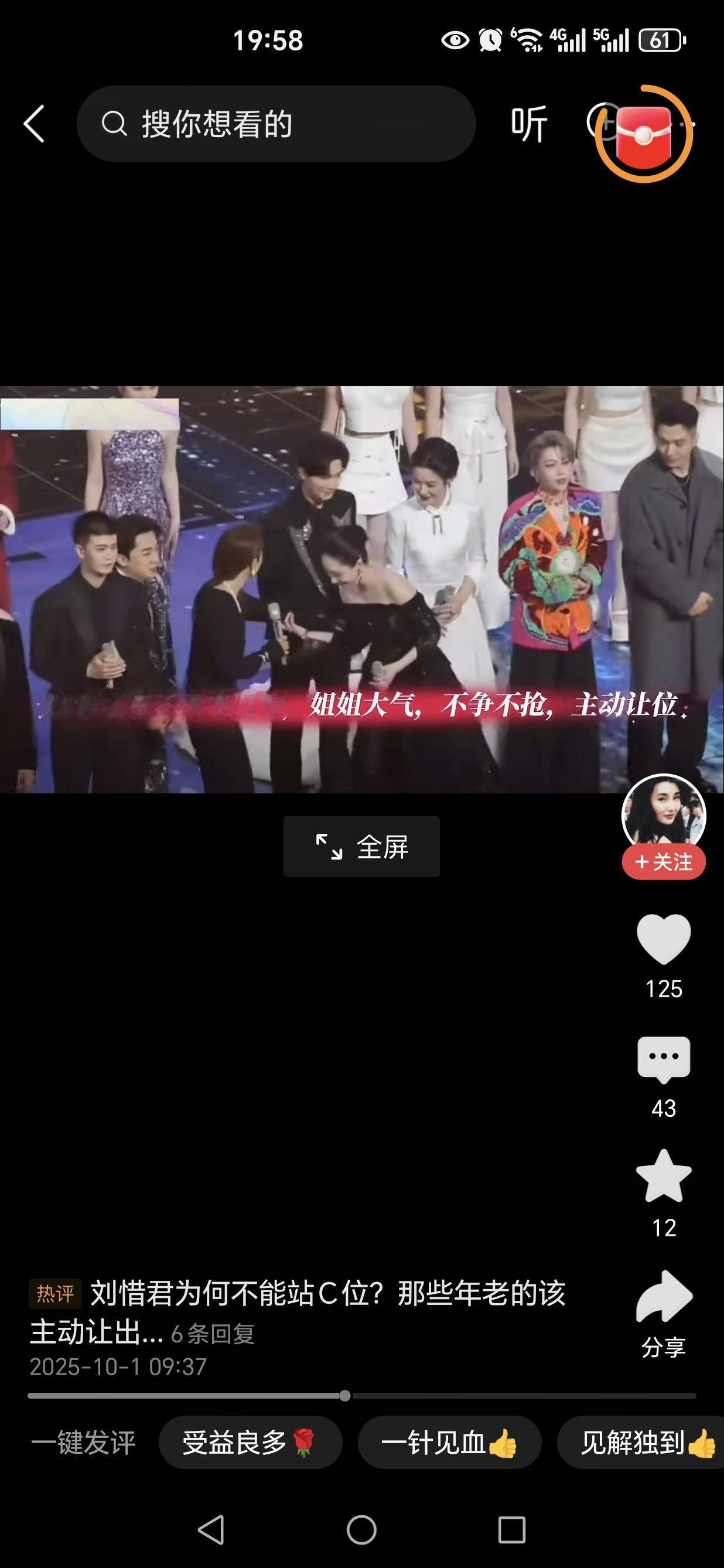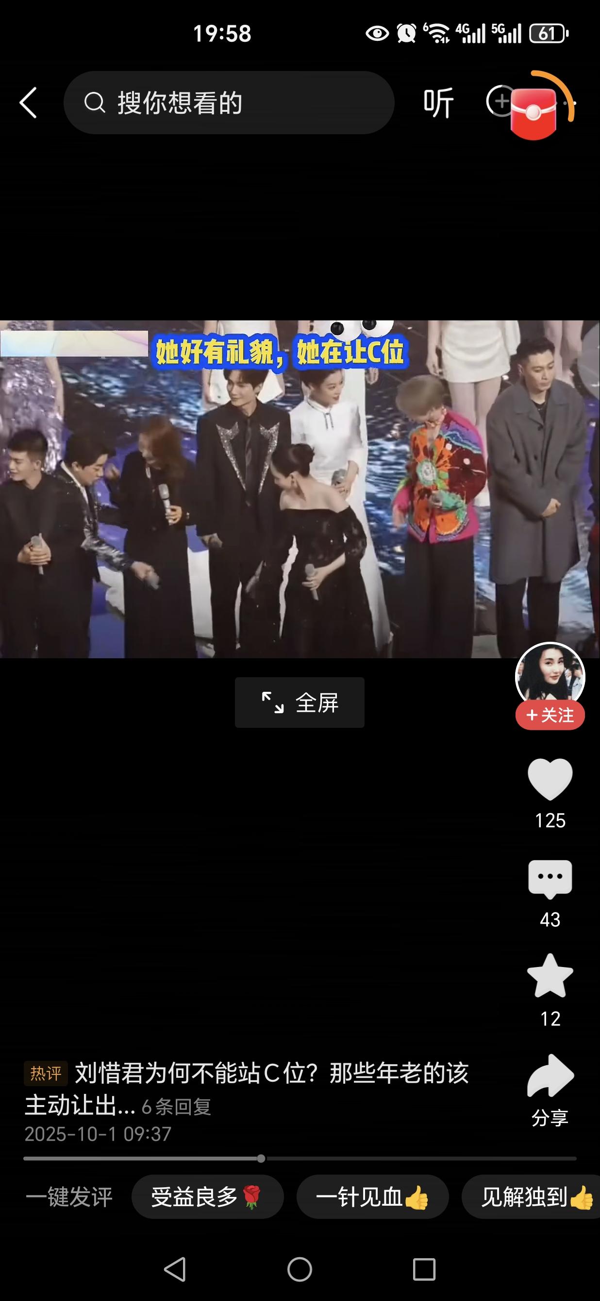 刘惜君在湾区晚会大合照时…“上春山”了[尬笑]。她横着走跨越了6位同仁,走向了很正的C位,走到中间后,还让了让C位,好像是让给惠英红、王祖蓝…… 期间,陈楚生一直默默站在后面,表情…生动…… 刘惜君能不能站C位? 李宇春都能一直站C位,为啥刘惜君不能[狗头][黑线]?