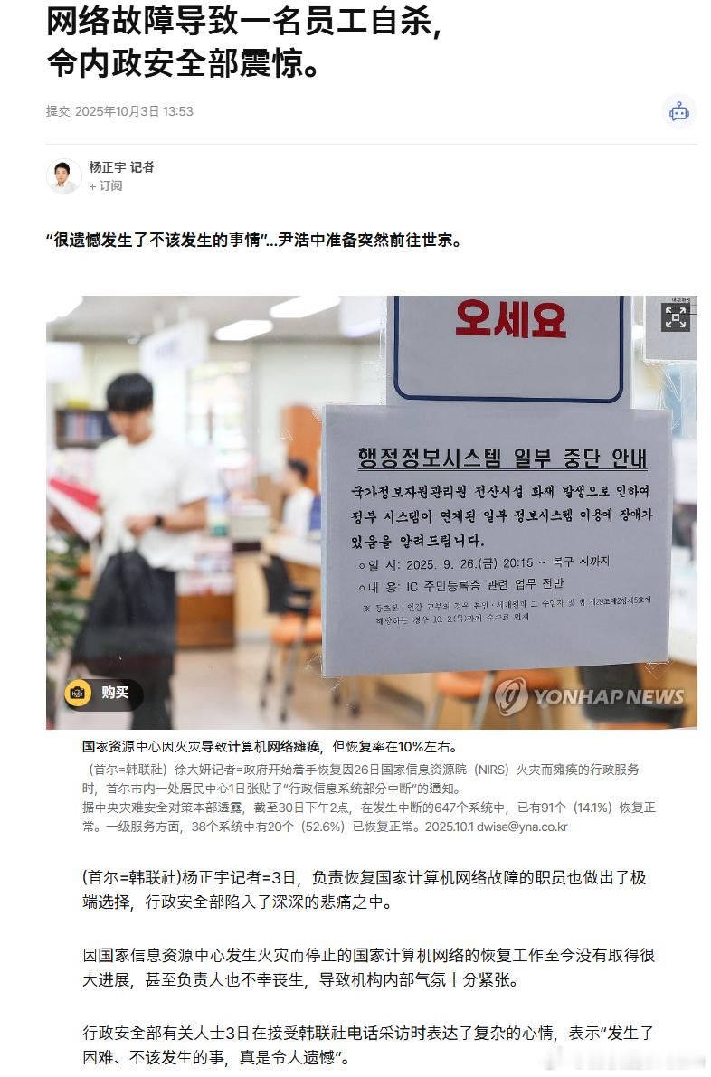 负责韩国电脑网络故障的一名负责人跳楼身亡,多么熟悉的剧本。韩剧都不敢这么拍啊,韩国这场火灾总要有人负责吧。[哆啦A梦吃惊][哆啦A梦吃惊]