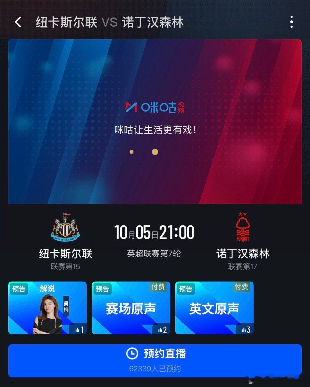 周日21:00英超 纽卡斯尔联vs诺丁汉森林 单口