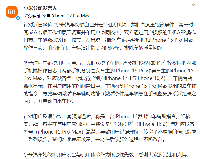 针对近日网传 “小米汽车突然自己开走” 相关视频,我们高度重视该事件,第一时间成立专项工作组展开调查并和用户协同核实。双方通过用户授权的手机APP操作日志、车辆数据等逐一核实,得出统一结论“车辆后台数据和iPhone 15 Pro Max操作日志、响应时间、车辆泊出指令均能匹配,排除车辆质量问题。”