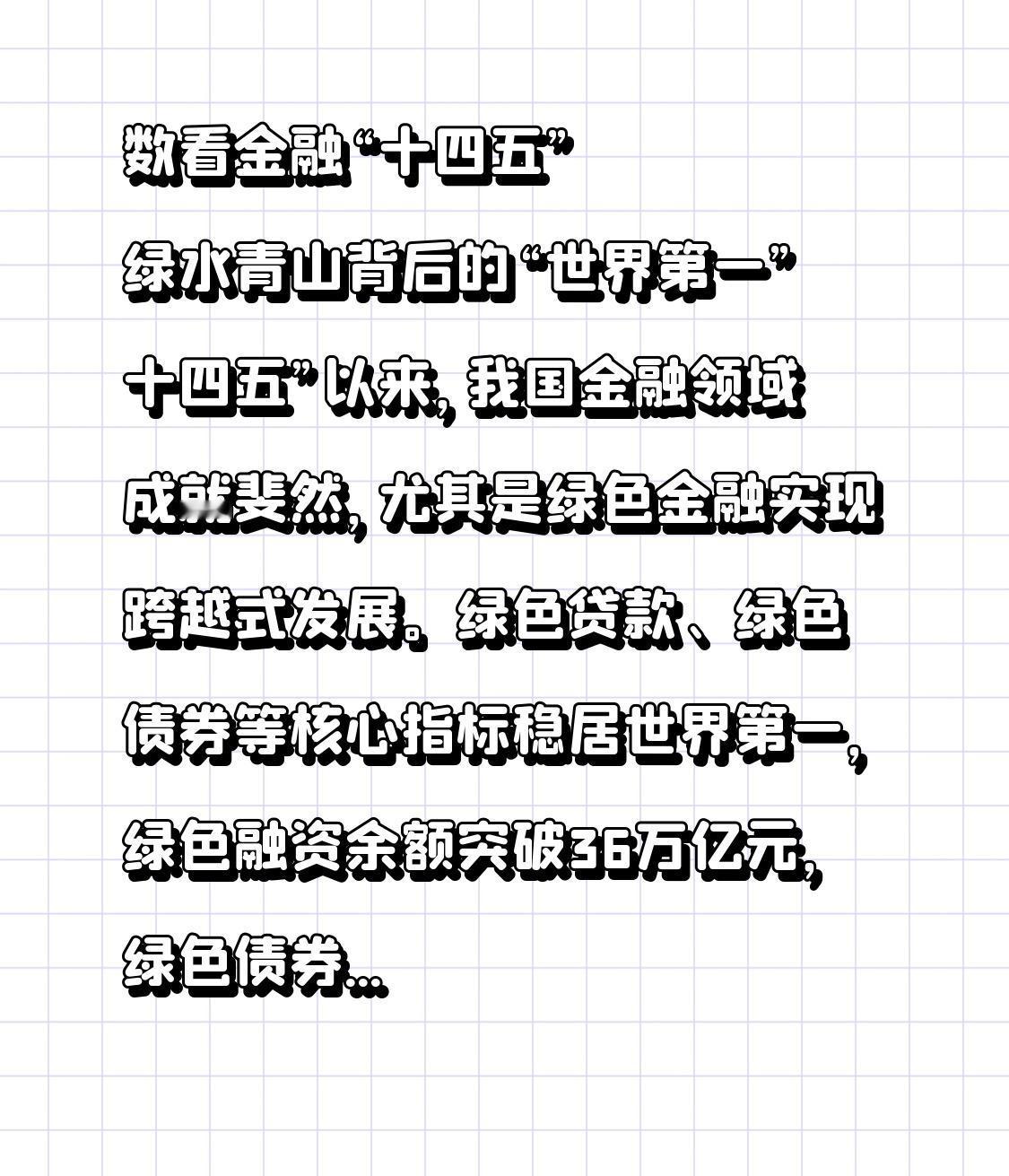 数看金融“十四五” | 绿水青山背后的“世界第一” 金融发展战略 绿水青山经济 十四五”以来,我国金融领域成就斐然,尤其是绿色金融实现跨越式发展。绿色贷款、绿色债券等核心指标稳居世界第一,绿色融资余额突破36万亿元,绿色债券存量超2.2万亿元。 这背后体现的是我国对绿水青山的重视。当下全球绿色转型进入关键期,我国绿色金融为新能源、节能环保等产业注入强大动能。 不仅如此,截至今年6月末,中国银行业总资产近470万亿元,位居世界第一。在“双碳”目标指引下,我国绿色金融前景广阔,将在全球气候治理与可持续发展中发挥重要引领作用。