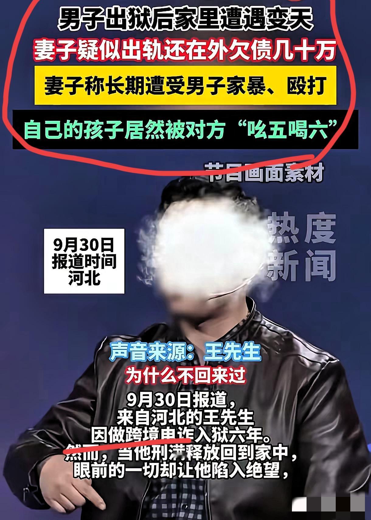 河北,男子服刑6年,妻子一直说等他,可他出来后,发现一陌生男子在自己家住了4年,小儿子还说见过妈妈和那男的 光着身子,妻子却嘴硬说人家只是租客。 更糟的是,家里几十万存款没了,还欠了40多万外债,妻子甚至说早跟他离婚了,反过来怪他家暴。 可王先生说当初签协议是为了不拖累家人,自己在国外违法挣的钱全寄回了家,现在大儿子也证实那男的跟妈妈像夫妻,妻子被逼急了才说“快窒息了”。 其实不管离没离婚,夫妻间忠诚和尊重是底线,家暴更不对。这事儿里没人是完全的赢家,好好的家咋就散成这样了? 你们觉得这事儿里,到底谁的问题更大?要是你是王先生,现在会咋处理?来评论区聊聊!