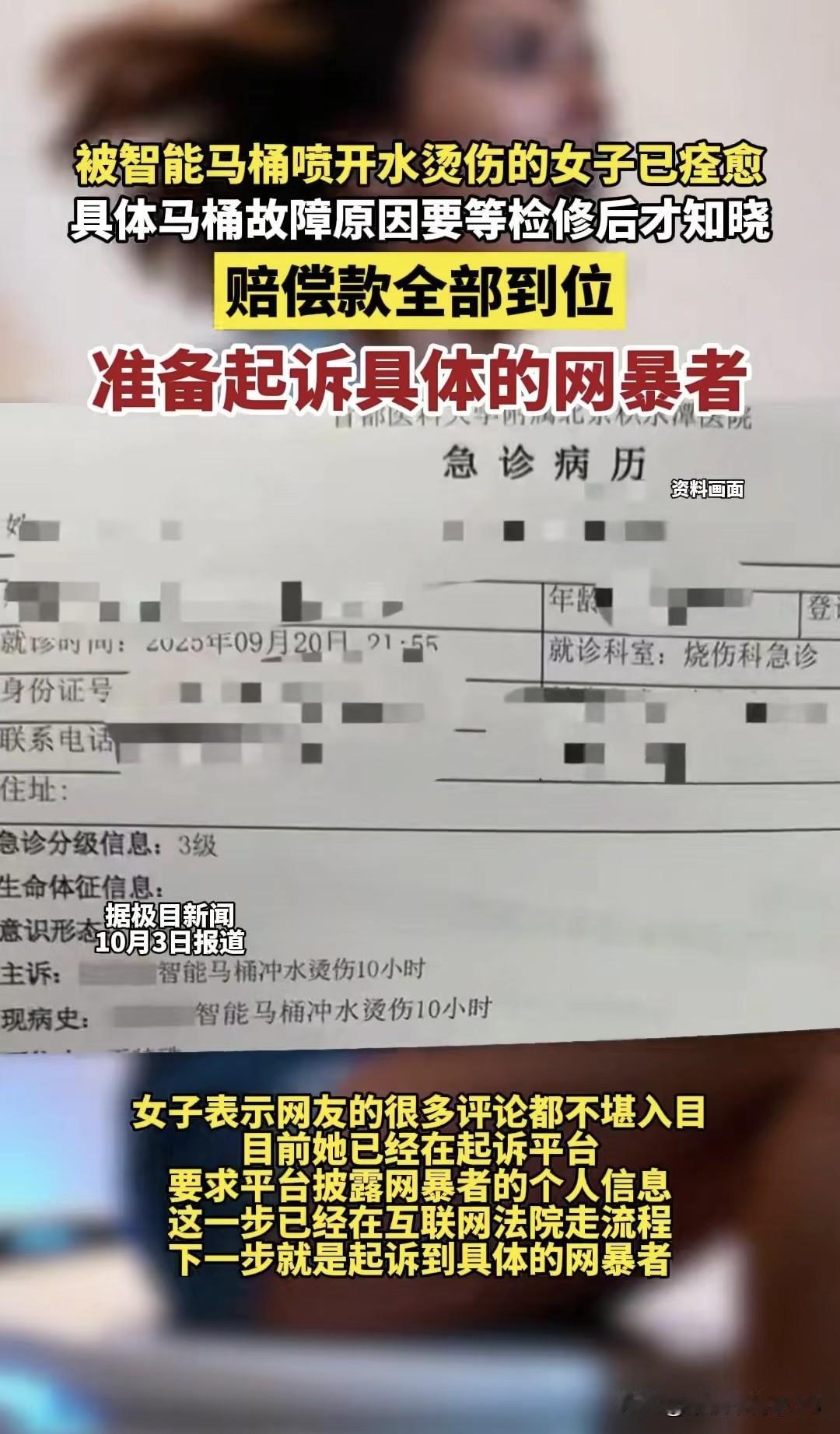 智能马桶变“开水刺客”,杭州女子被烫成二度烧伤! 本以为智能马桶是提升生活幸福感的贴心管家,结果浙江杭州一姑娘直接被自家智能马桶喷出的滚烫开水烫成了二度烧伤。 这女子家的智能马桶用了3年多,平时偶尔水温偏高她也没当回事。结果某天按下清洗键后,马桶突然喷出滚烫冒烟的开水,她当场被烫得跳起来,会阴部位剧痛难忍。紧急用冷水冲了整整一小时才勉强缓过来,自己涂了网购的烫伤膏也不管用,最后去医院一查确诊是二度烫伤。 事发后她在社交平台曝光了自己的经历,还艾特了品牌官方。好在厂家反应挺迅速,态度也很诚恳,很快就主动联系她,双方已经达成和解。 而网友的各种不堪入目的评论却让女子受不了了准备起诉网暴者,对此你怎么看?