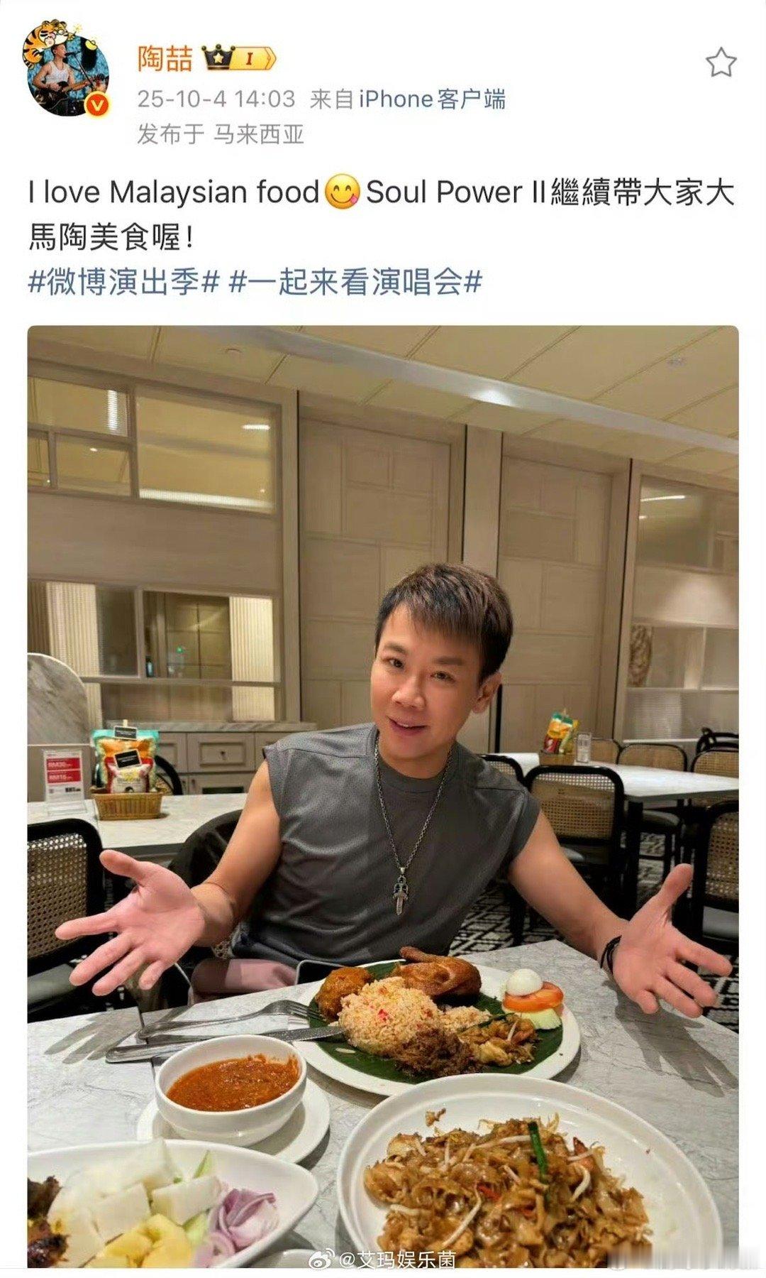 陶喆已经在马来西亚吃上了 陶喆这波“干饭速度”绝了!刚到马来西亚就先安排上当地美食,“陶美食”的称号不是白来的,吃饱喝足才能在舞台上发光发热,期待接下来的表演!