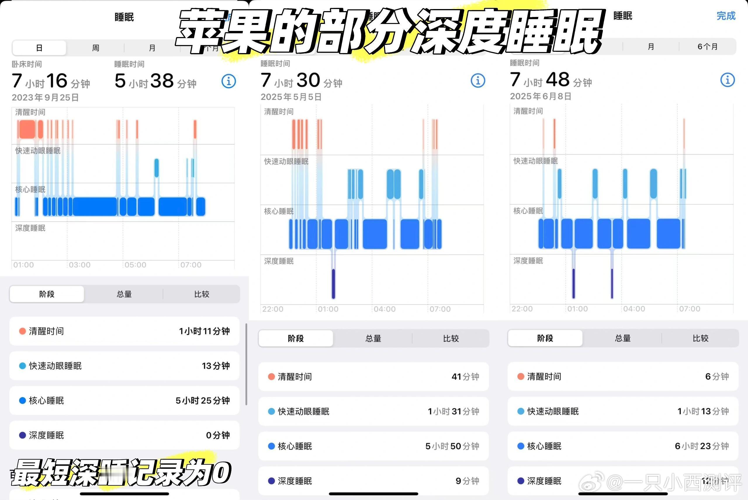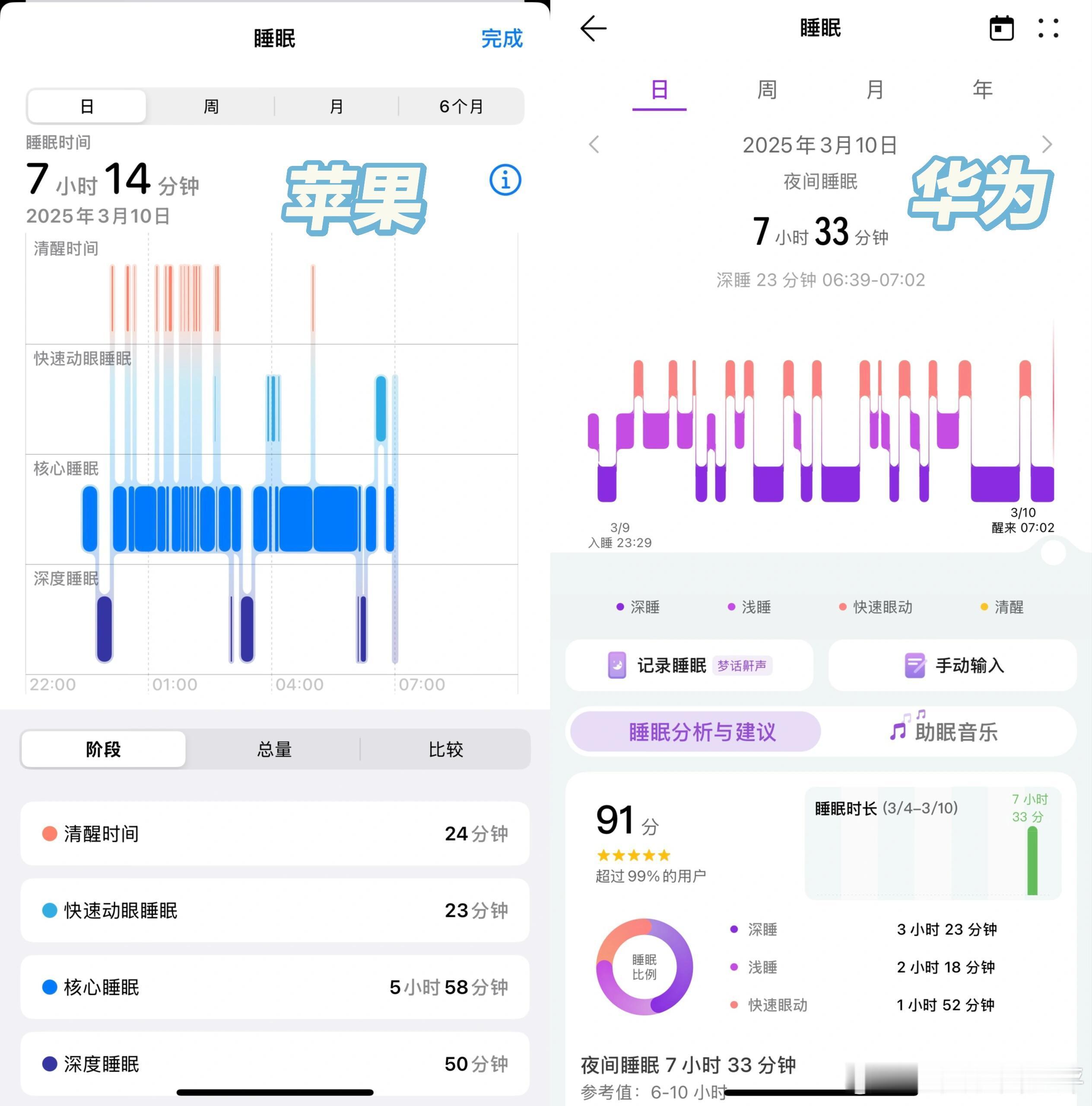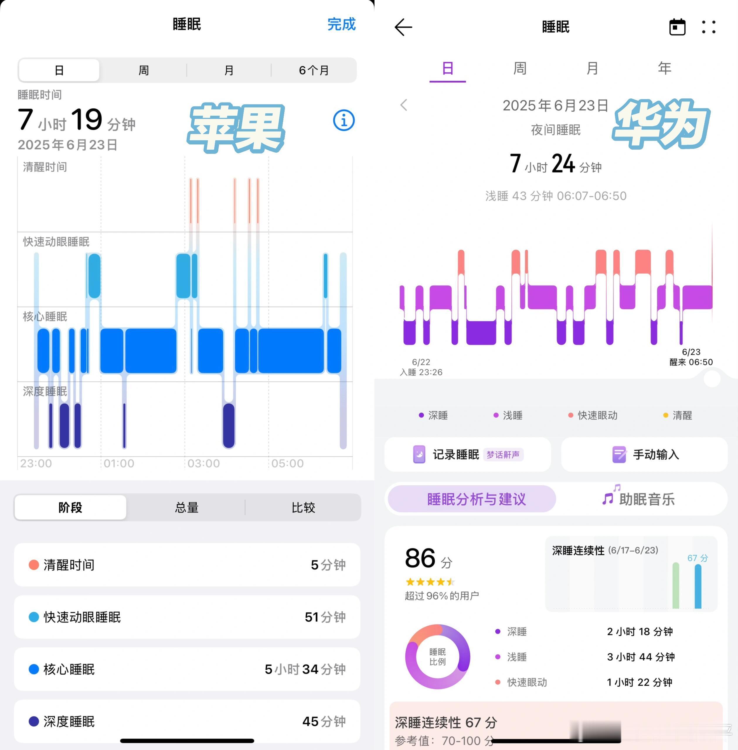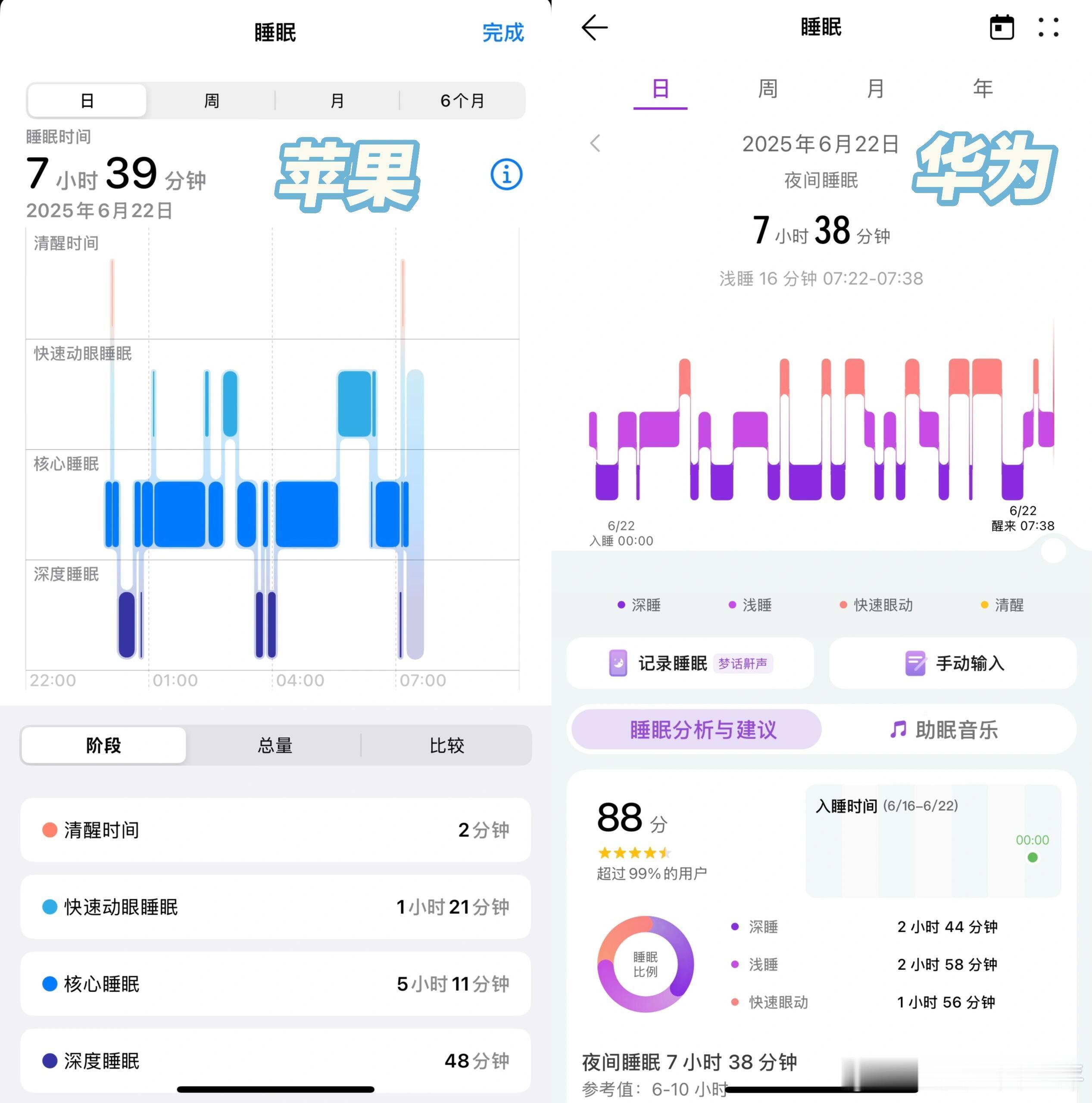 2. 苹果手表更贴近我个人的睡眠状态,尤其是对清醒时间和深度睡眠的记录更符合实际情况;