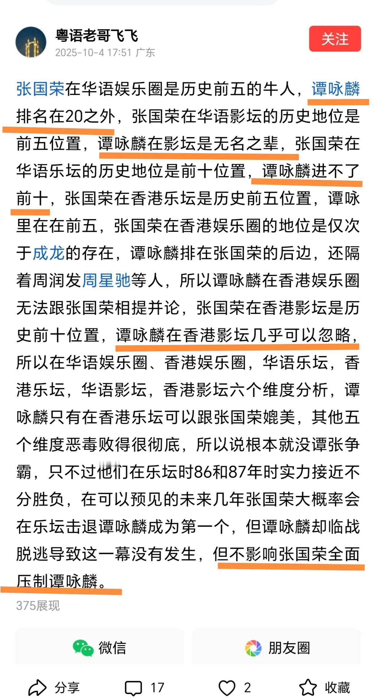 我曾经几次在一些张国荣粉丝评论区留言,都设限不让别人评论,为什么不让评论?无非是怕别人用事实反驳他!我发现,凡是基粉都是满口放大炮!从不以事实为依据!谭咏麟在影坛方面是无名之辈?谭咏麟是影帝难道基粉不知道?在乐坛方面,在谭咏麟宣布退奖之前,张国荣一直在摸谭咏麟的屁股!有很多荣誉和成绩为依据!