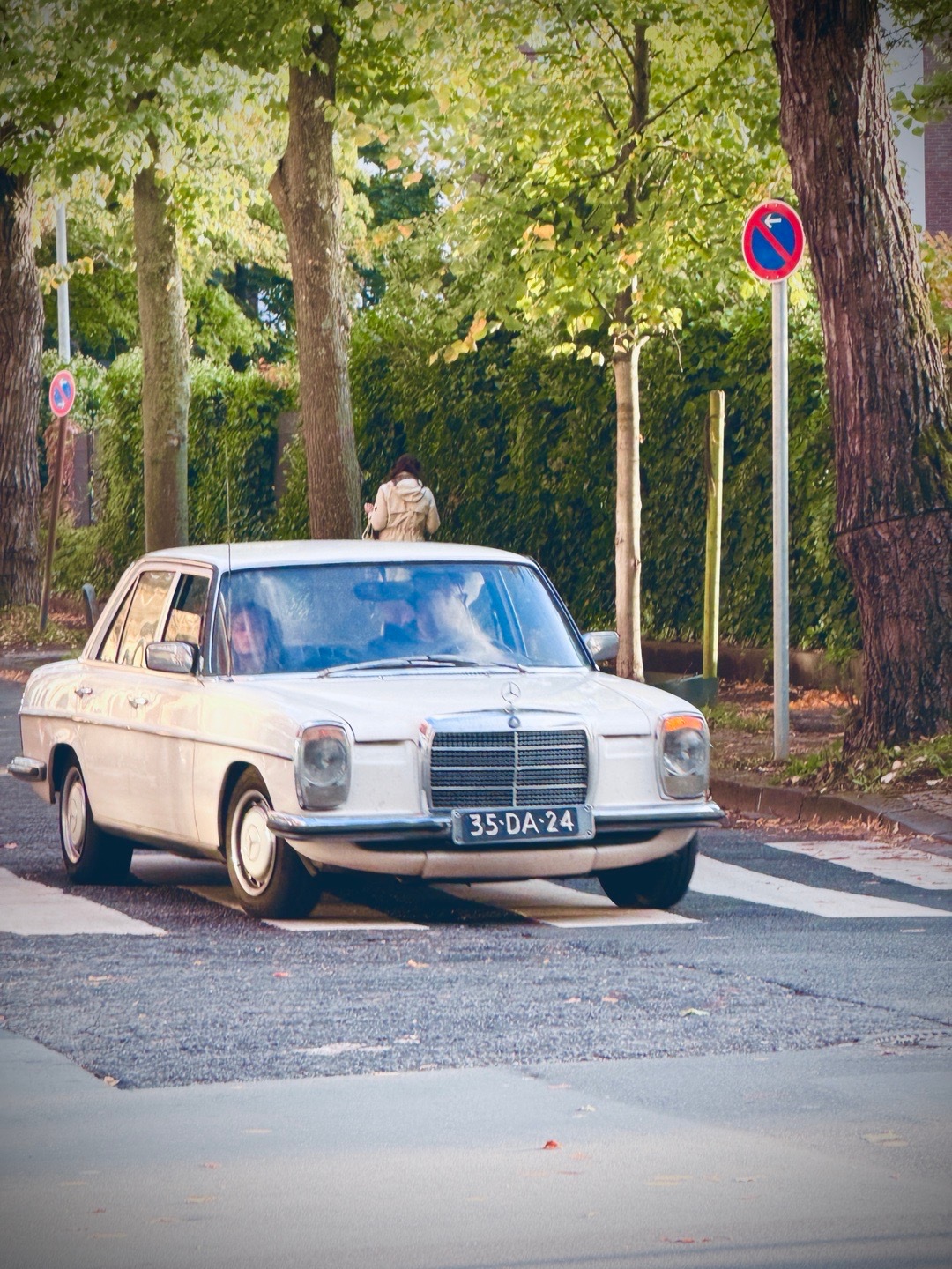 可能副驾嫌弃50岁的老奔驰W115太吵了[并不简单]带了大耳机,车牌是1978年老式荷兰车牌。