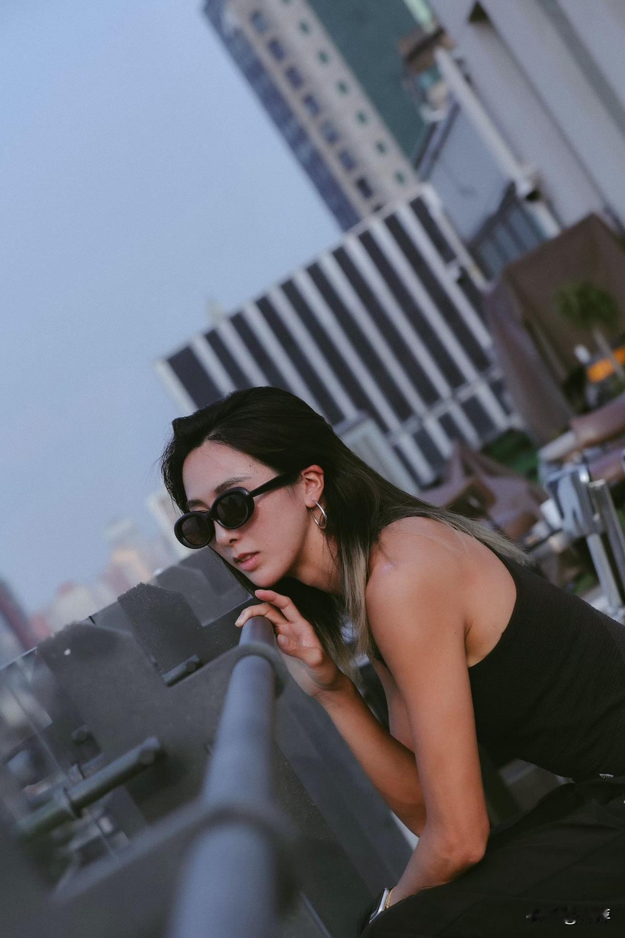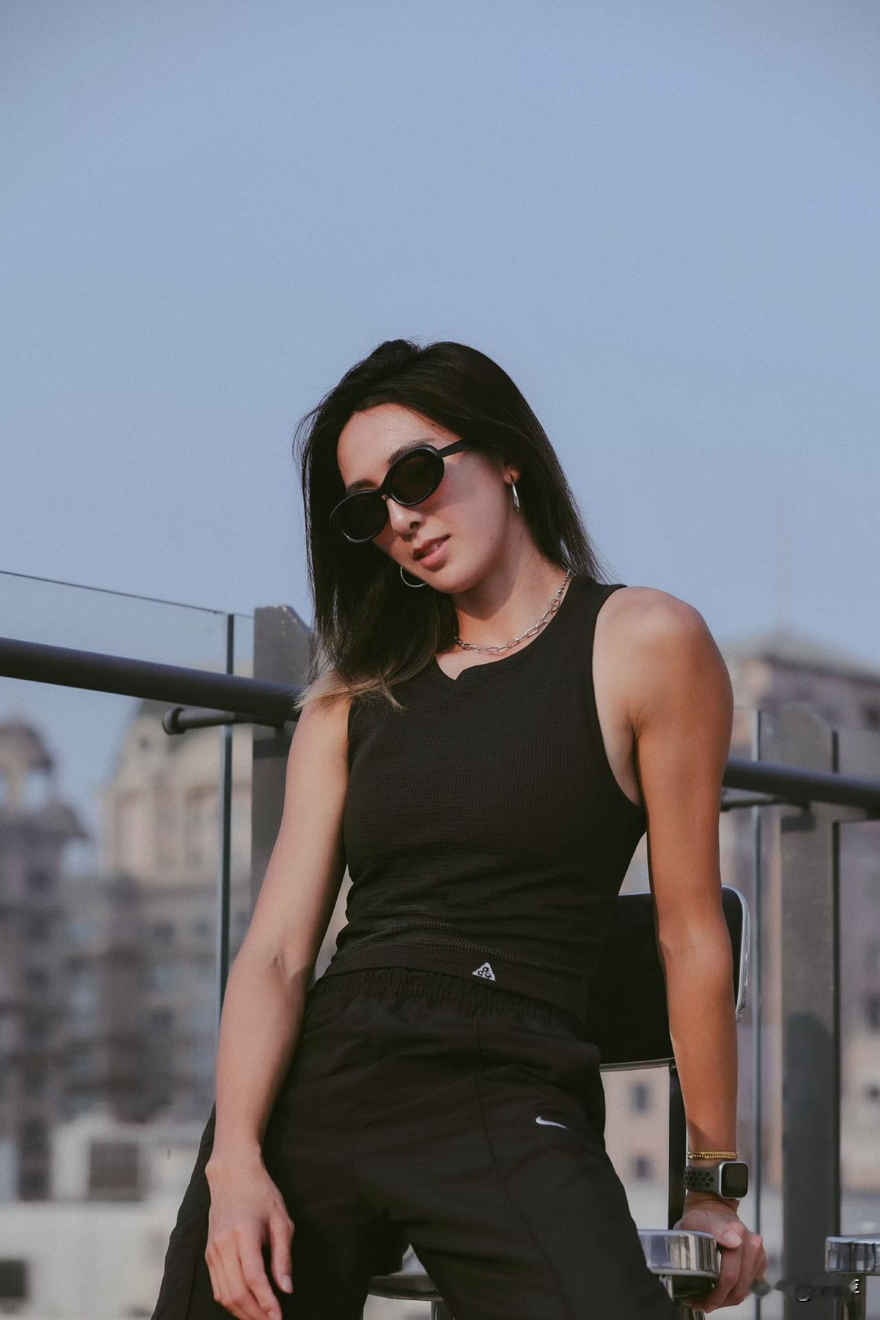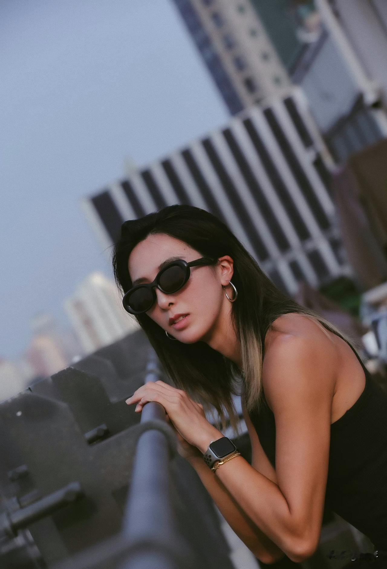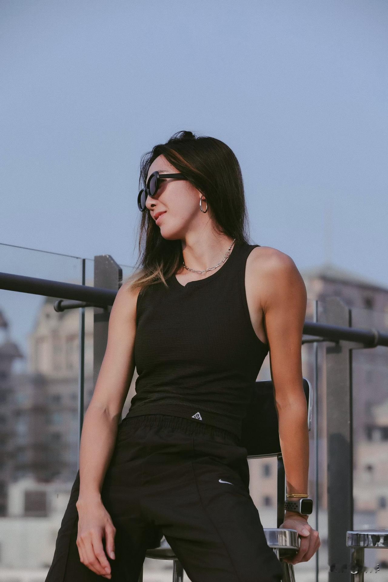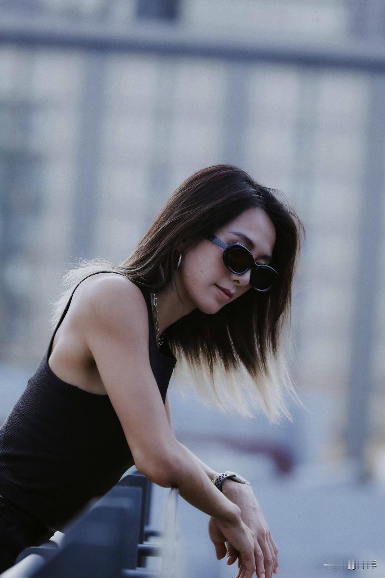林雨薇.一身酷黑造型,黑色背心搭配同色休闲裤,墨镜加持,在城市背景下,尽显飒爽利