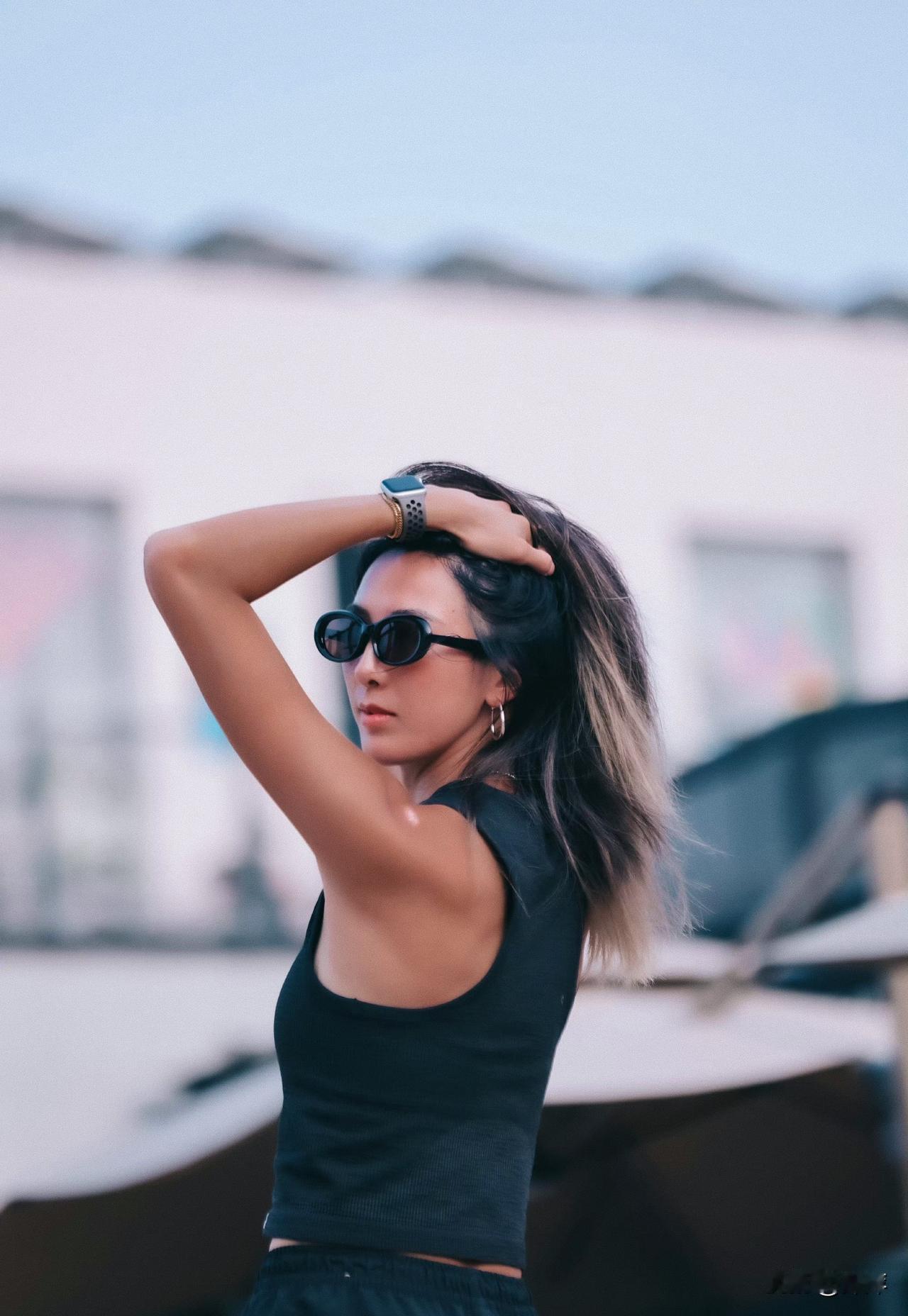 林雨薇.一身酷黑造型,黑色背心搭配同色休闲裤,墨镜加持,在城市背景下,尽显飒爽利落,仿佛将“酷”字穿在了身上。