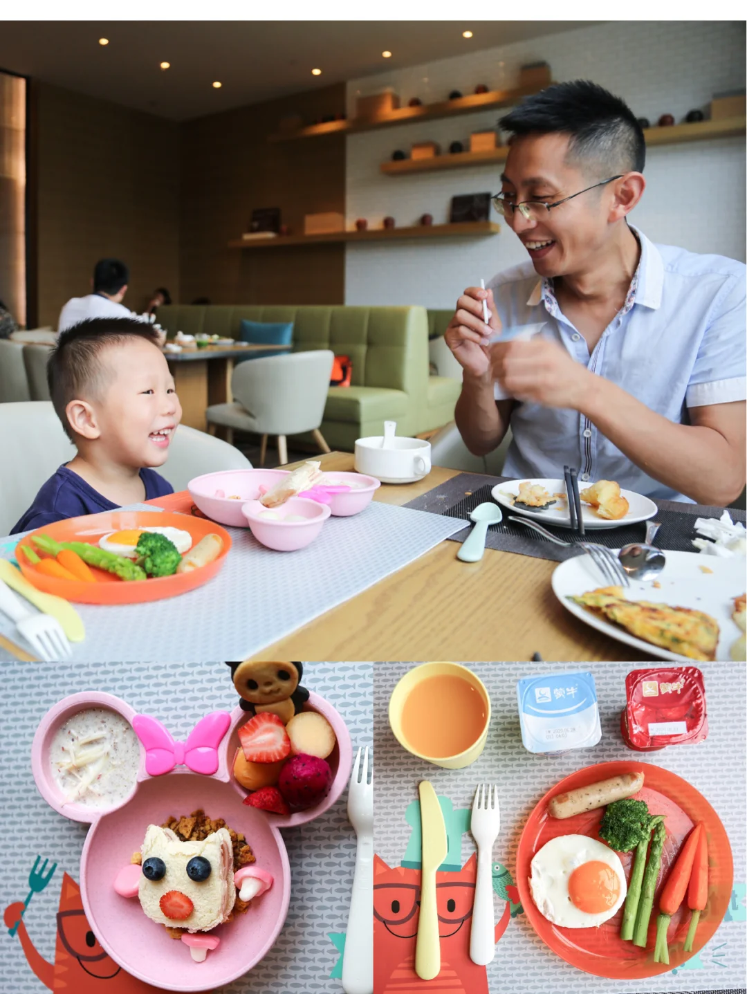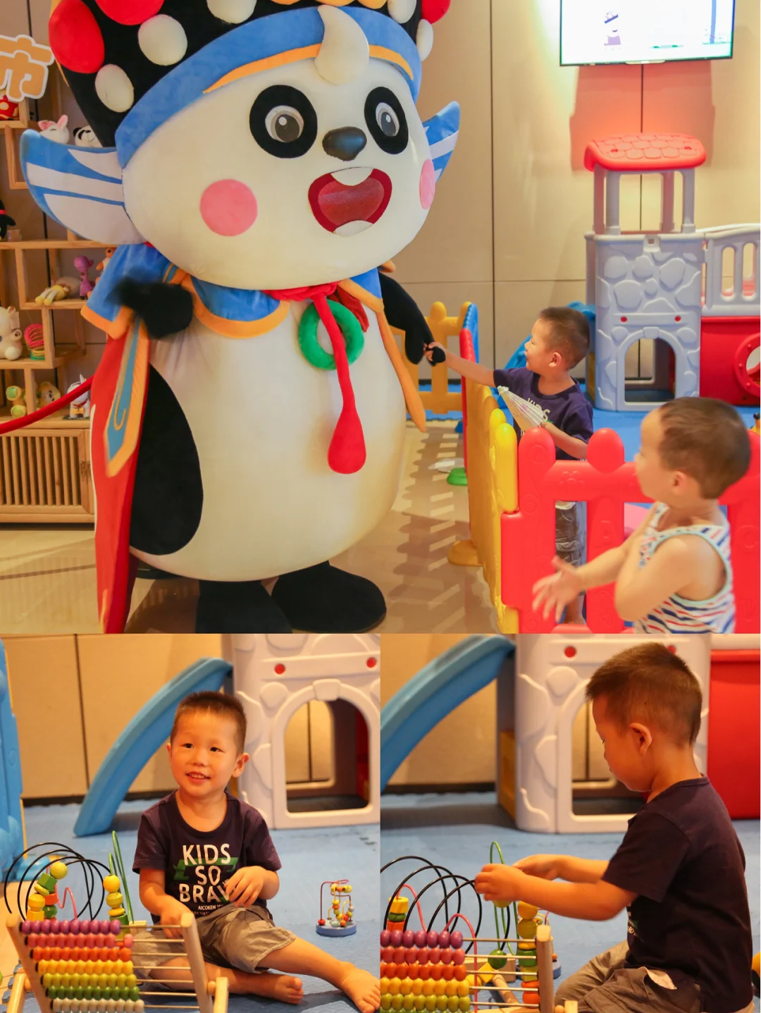 有室内游泳池,24h健身房,星级酒店配套一应俱全,晚餐前还有一系列丰富多彩的亲子体验活动:油纸伞手绘和环保袋手绘等~餐厅对面是一个小型儿童乐园,大堂还有孩子们最喜欢的人偶熊猫和棉花糖,玩到根本不想离开