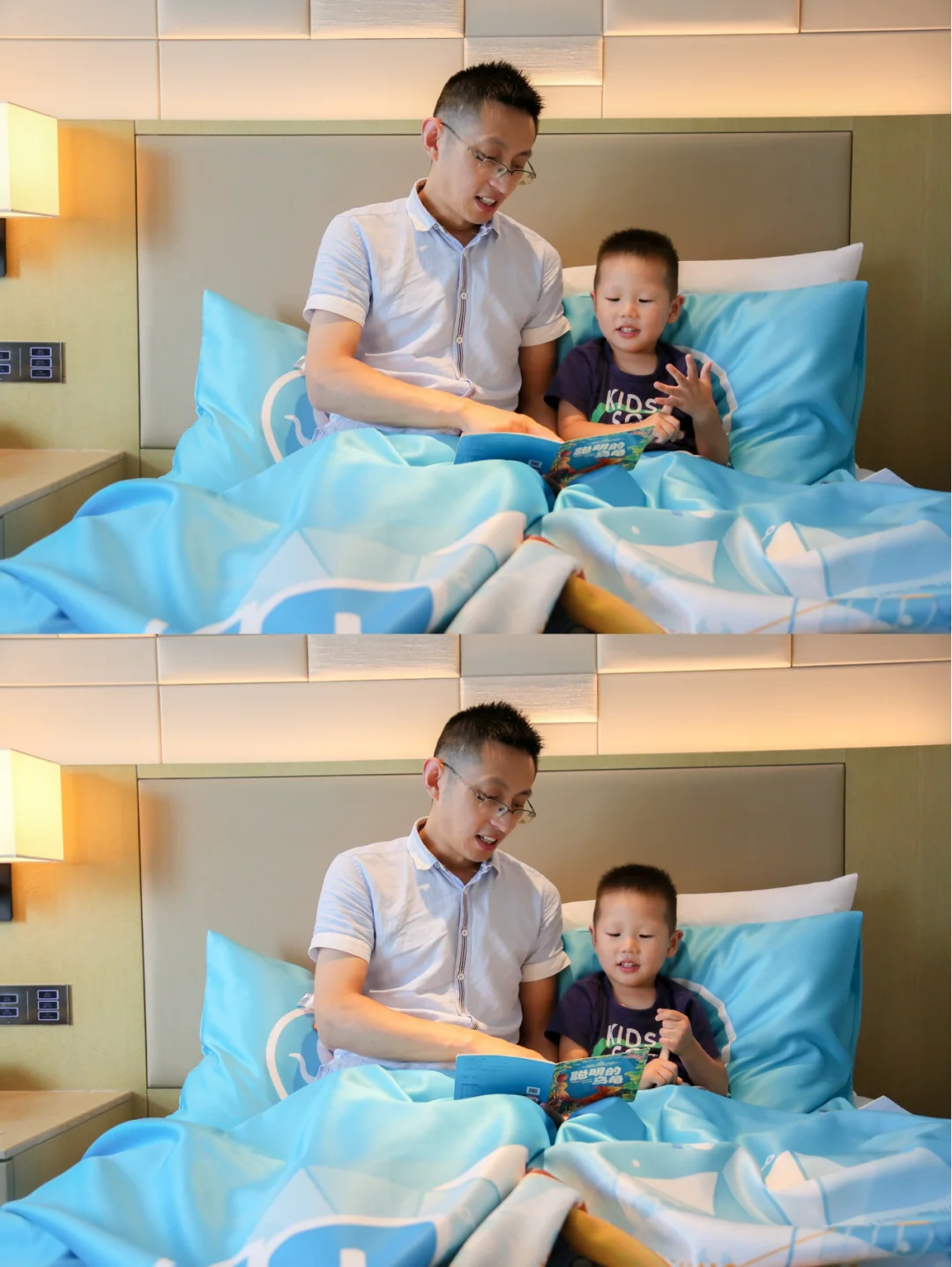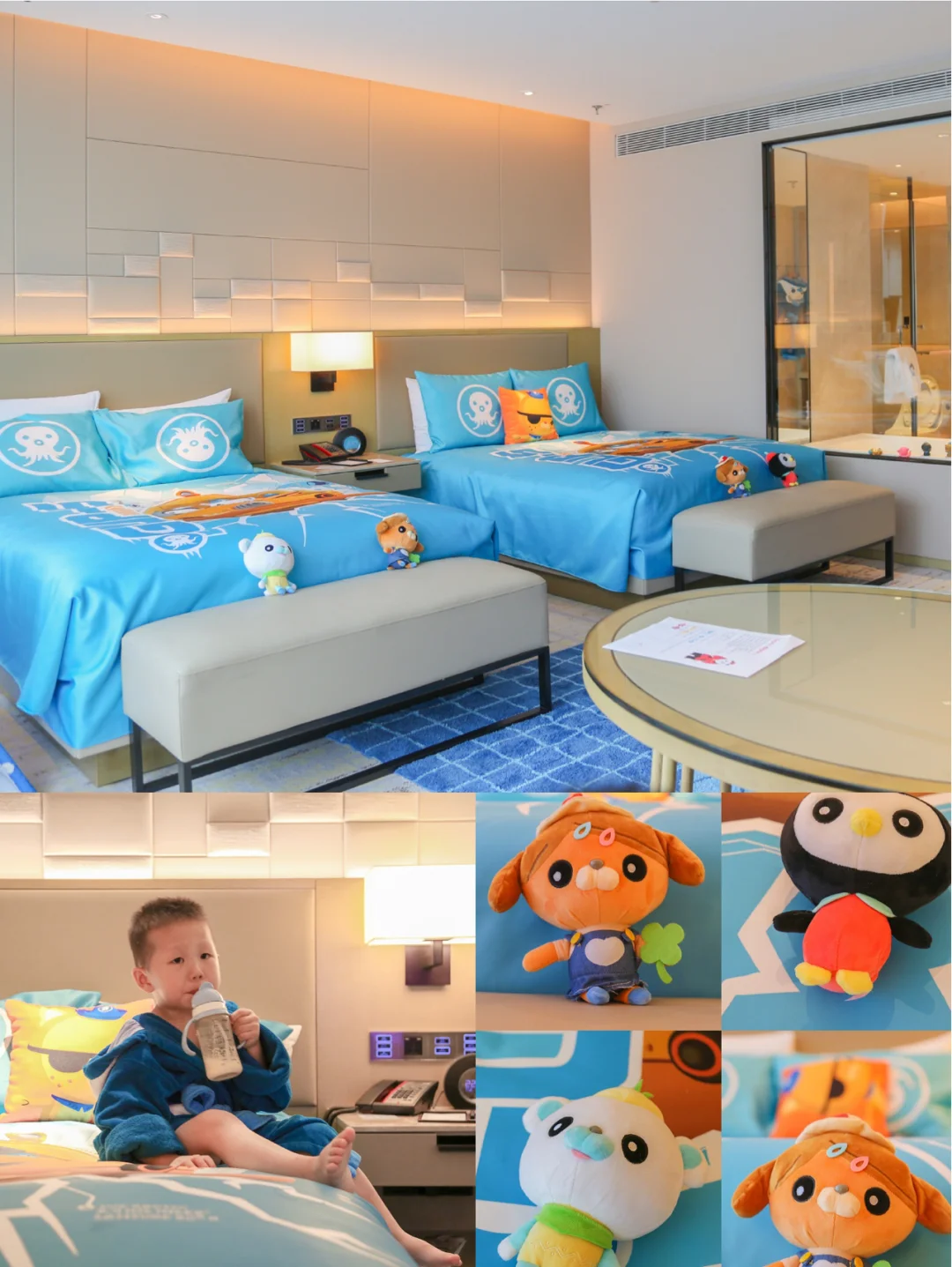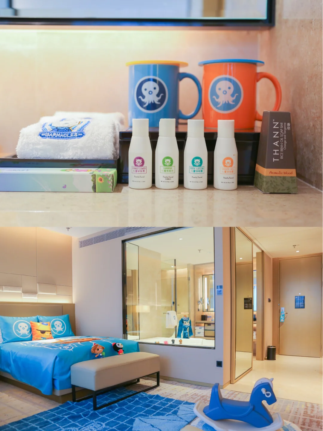 房间全景落地窗,一览金融城夜景,亲子房里装饰“海底小纵队”里的动物形象,各种卡通造型玩偶,小小帐篷可爱的木马,贴心配备了儿童专用板凳和洗漱用品、浴袍拖鞋,杯子等都印有可爱的图案童趣十足,孩子玩的都舍不得睡觉了💤