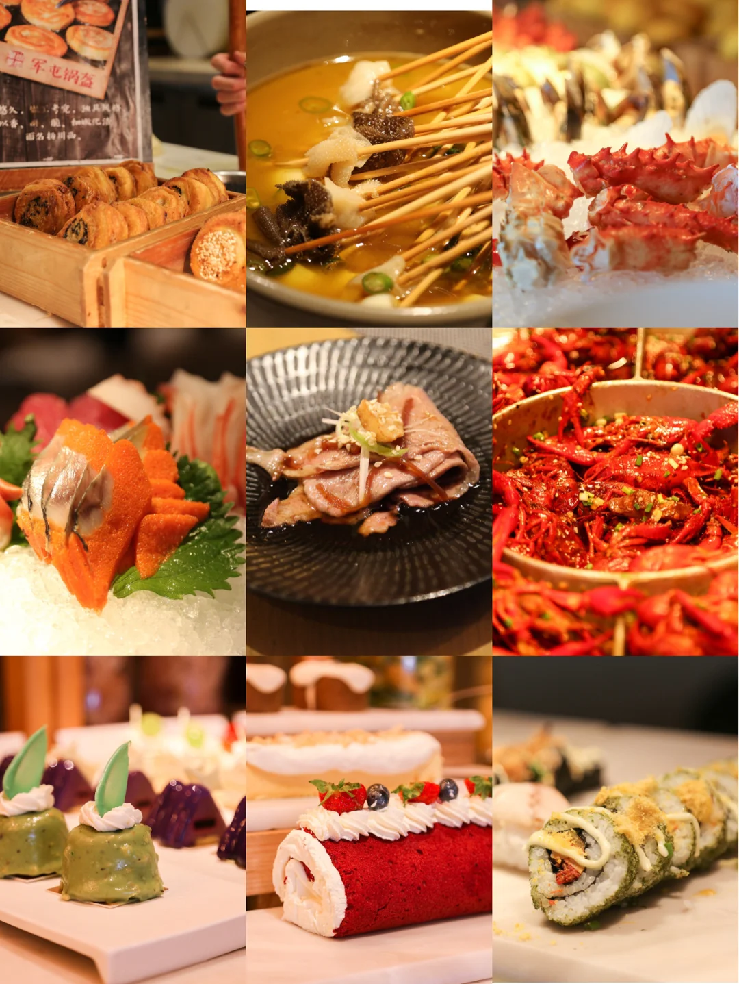火焰鹅肝、菌汤牛肉锅、把把烧,各种甜品、进口冰淇淋🍦……叮叮糖、糖葫芦,蛋烘糕,各种酒水饮料不限量畅饮,小龙虾🦞无限量供应