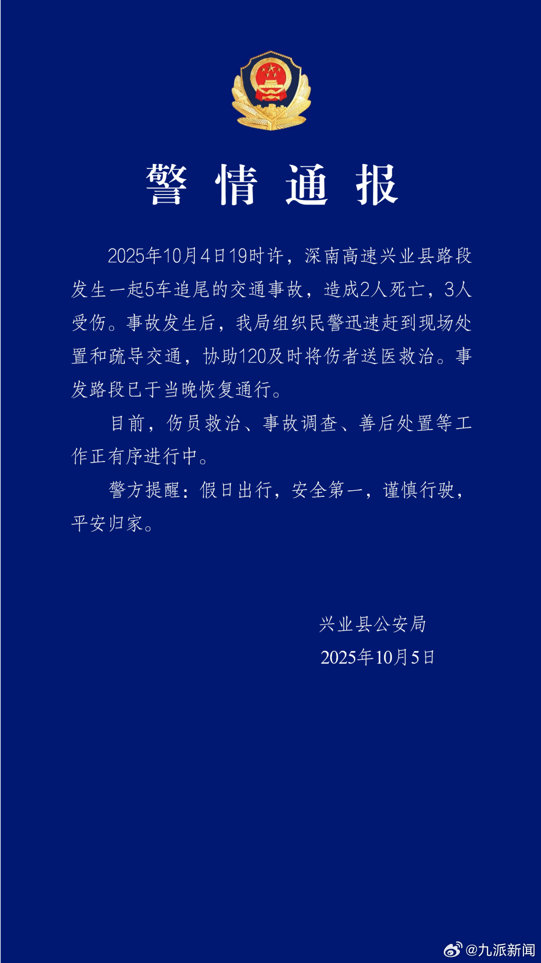 【广西兴业#警方通报高速5车追尾致2死3伤#】10月5日,广西兴业县警方发布警情通报:2025年10月4日19时许,深南高速兴业县路段发生一起5车追尾的交通事故,造成2人死亡,3人受伤。事故发生后,我局组织民警迅速赶到现场处置和疏导交通,协助120及时将伤者送医救治。事发路段已于当晚恢复通行。目前,伤员救治、事故调查、善后处置等工作正有序进行中。警方提醒:假日出行,安全第一,谨慎行驶,平安归家。