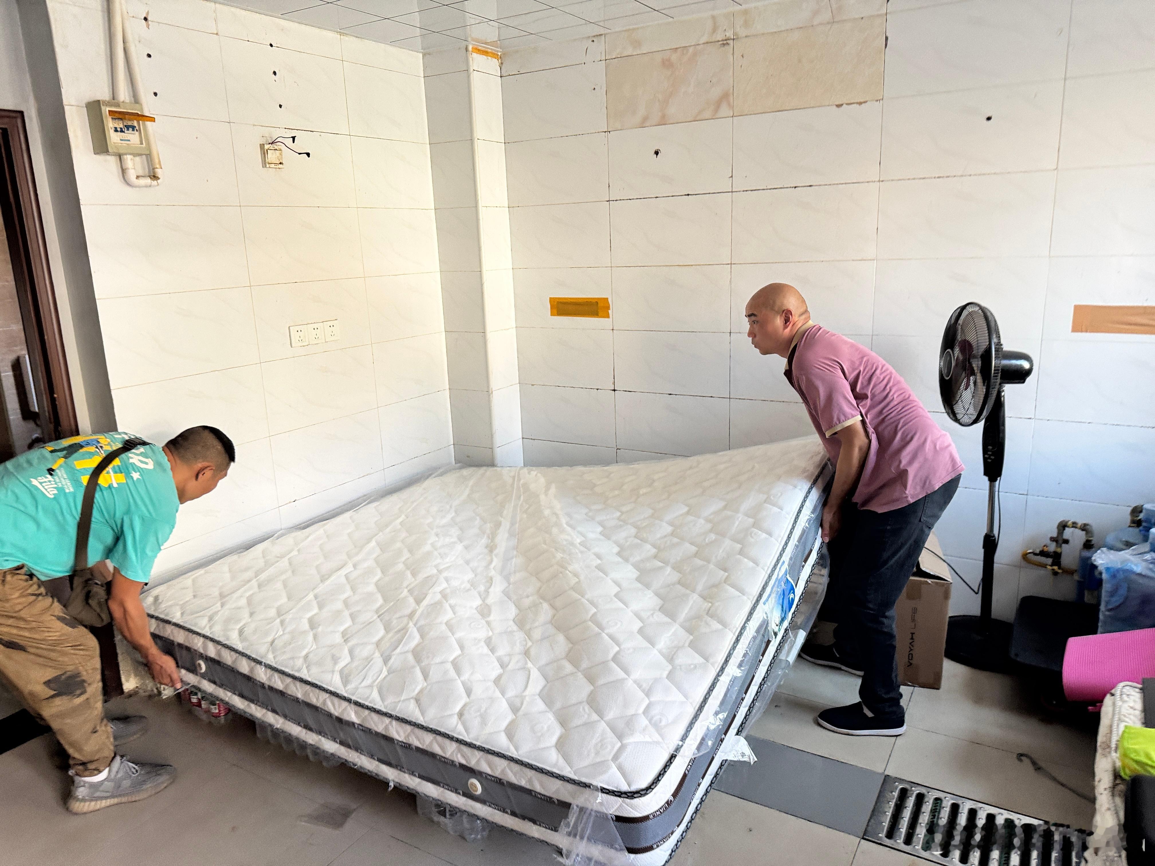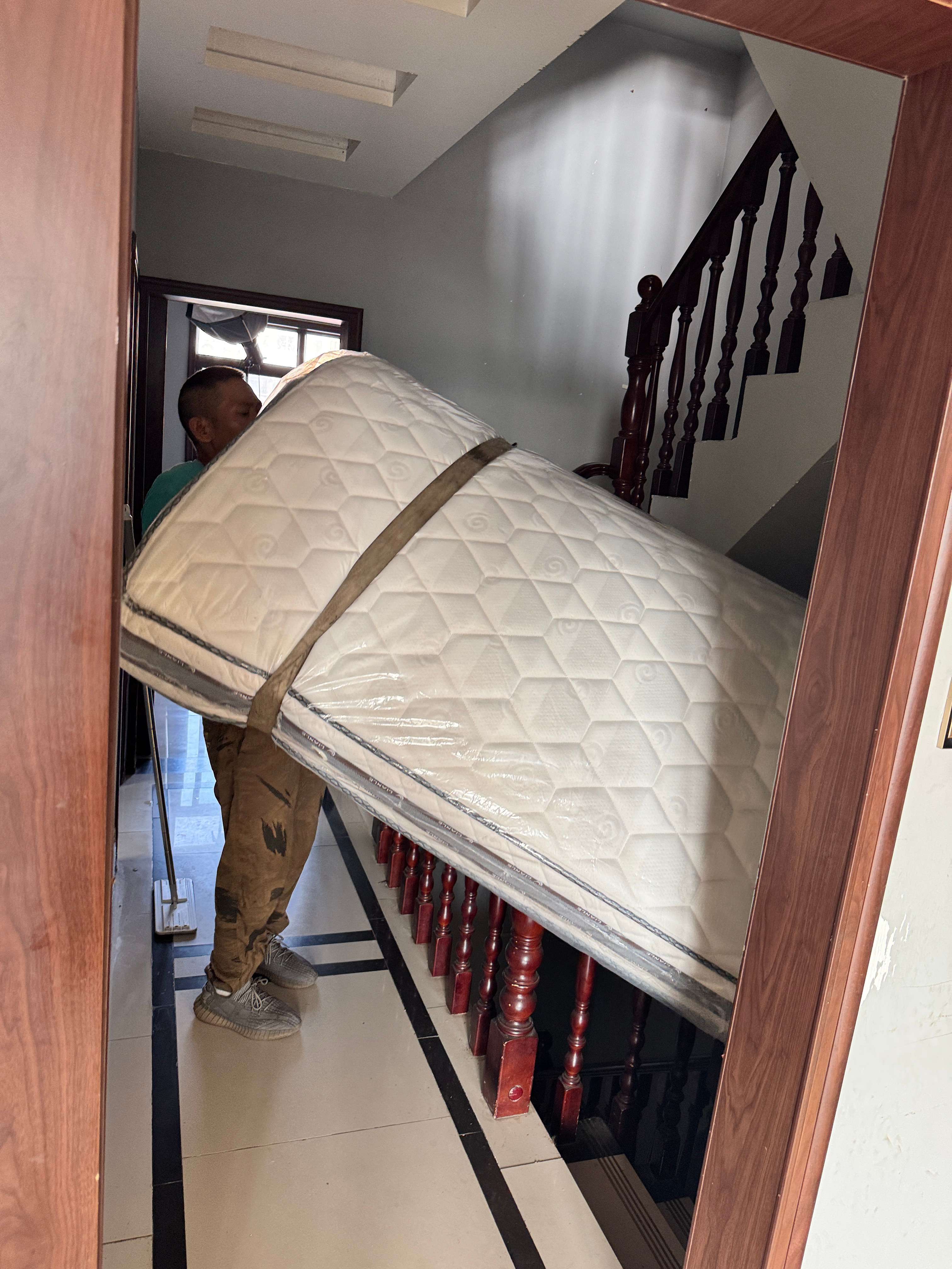 这个床垫挺难搞的,1.8x2的大尺寸,而且本身也很重,楼梯比较狭小,需要把床垫折弯的同时,还要往上推举,华容道但是垂直方向的