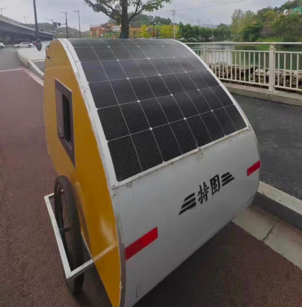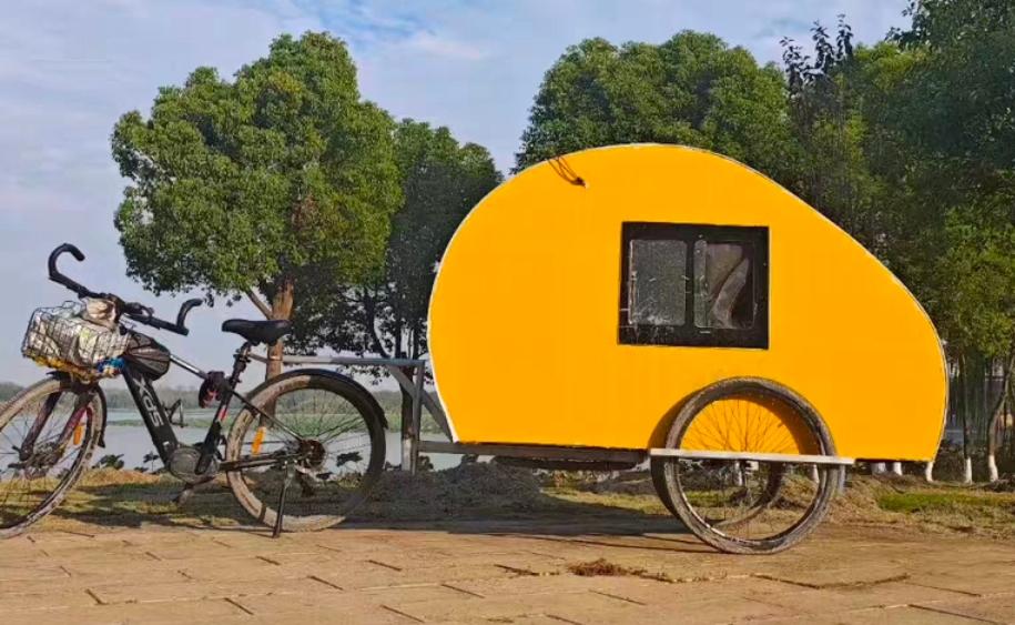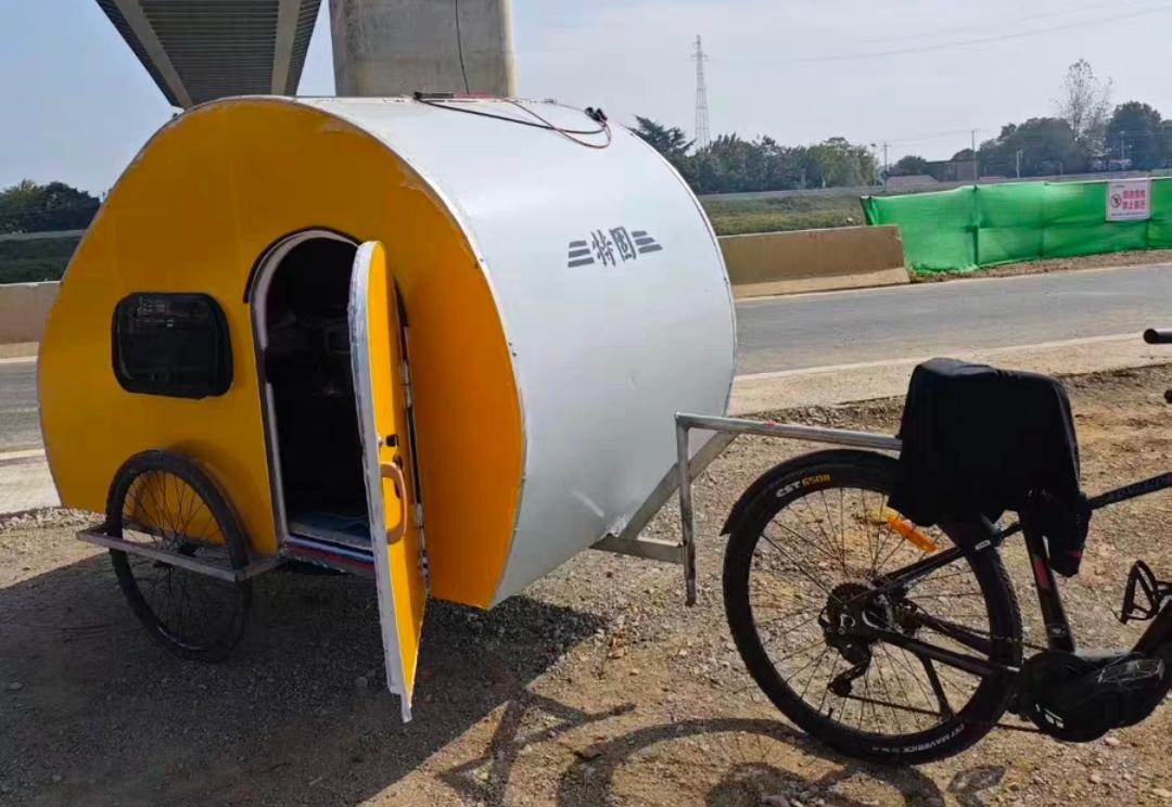 百公里只需啃半块红薯,助力山地车拖挂小房车来了,自行车牵引蜗牛露营车登场。这是一