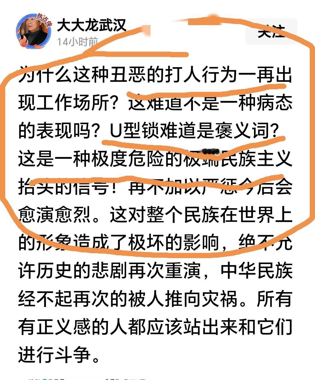 成都漫展有人COS辱华角色被揍。 你故意挑衅在前,就不要怪人克制不了情绪。所以,两个字送给他:活该! 当然,出现这种事情,必然就有很傻很天真的货出来献丑了。就字面意思的献丑。 打人是丑恶行为吗?连点血性都没有的民族能在这个世界活下去才怪。打人要看被打的是谁,才可以判断打人这个行为是好是坏。 提到U型锁我一点也不意外,但凡有这样类似的事,U型锁和义和团必然会被他们拿出来说事。如果不知道什么叫给人群贴标签,那其实他没有资格谈这个话题。 最后上升高度,把这个行为定性为极度危险的极端民族主义。 其实在这些人眼里就是别人可以随便侮辱你,但你不能反抗。你反抗就是不对。 不信,你问他支持以色列还是哈马斯,他肯定支持以色列。 点右上角关注我,我们一起去看这个魔幻的世界