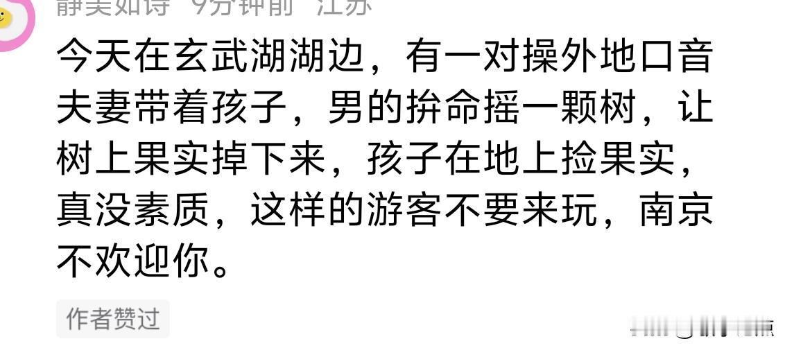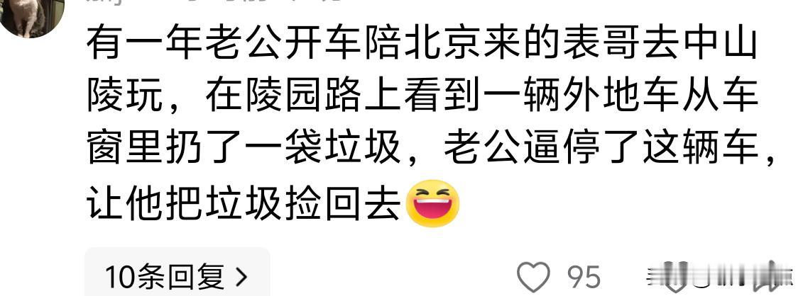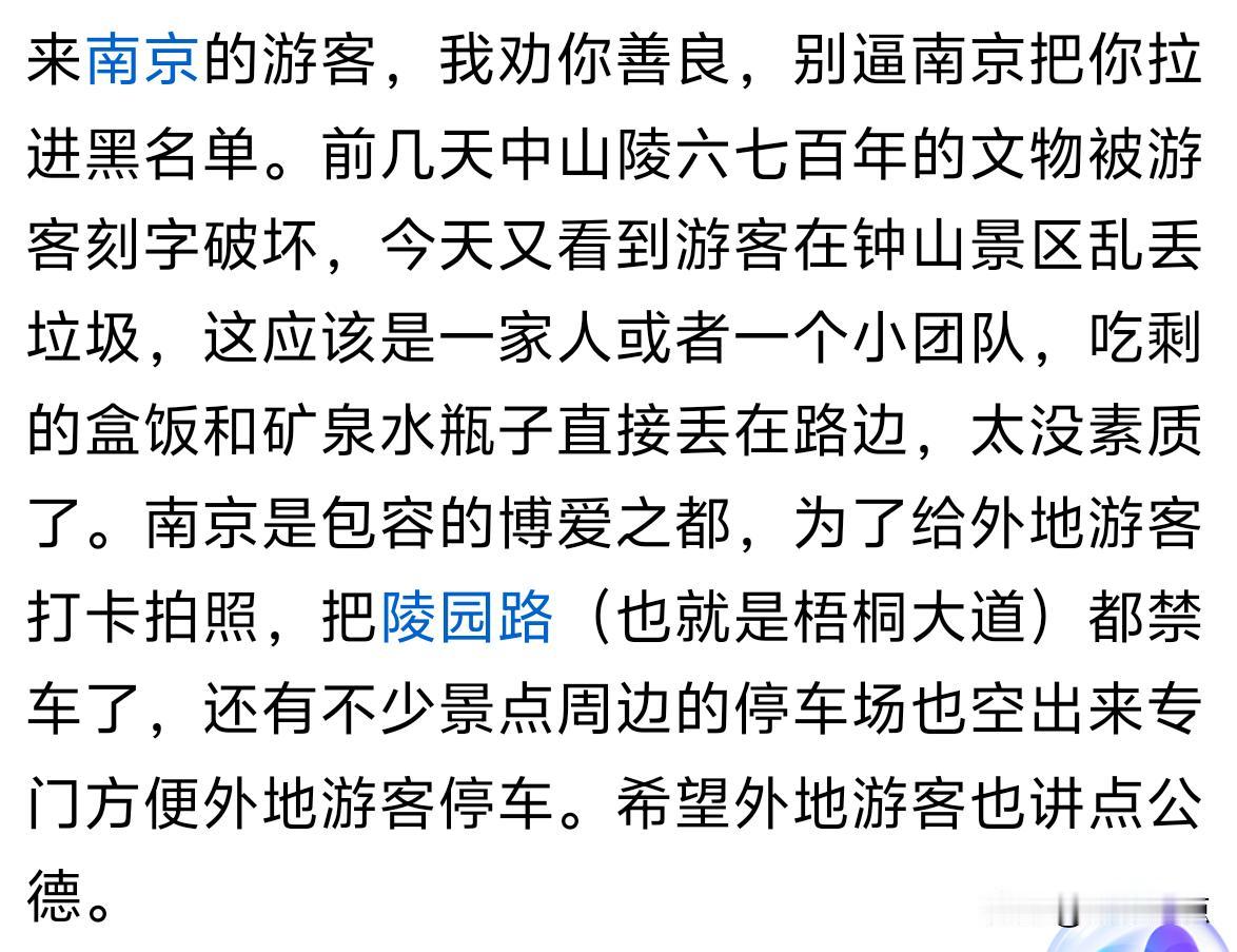 这就是国庆节南京钟山风景区,个别游客送给革命先驱孙中山先生的“见面礼”。 这样的人不仅南京不欢迎你们,全国都不欢迎你们,新闻发出来,真让全体国人丢脸。 义务教育普及多年,学校讲过什么是社会公德,素质教育从小就抓起,可是对他们怎么不起作用? 当一个家庭只有养,没有教时,坏习惯就养成了,第一任老师,自己的父母随地吐痰,随手扔垃圾的行为已经从生活中示范给他看了,在他还不知对错的童年里,习得了父母的恶习,埋在骨子里的习惯光靠学校轻风细雨的指导是纠正不过来的,只要在一没人监督时,本性马上就露出来了。 只有一个办法可以让这种人不敢露出本性,那就是新加坡的鞭子,不痛彻心扉,怎能记住教训。