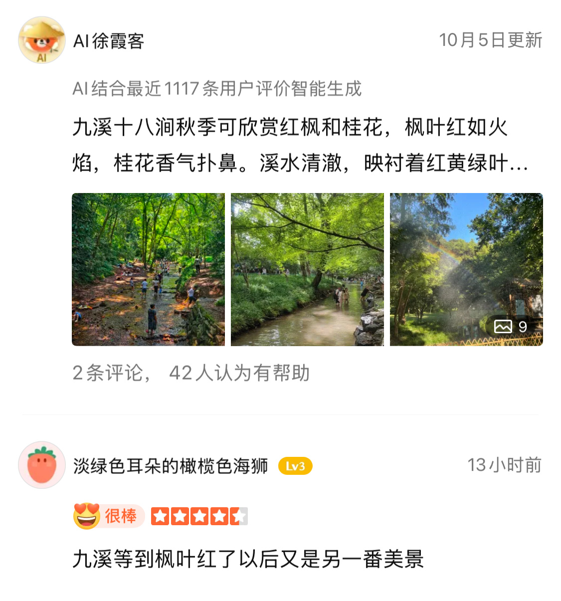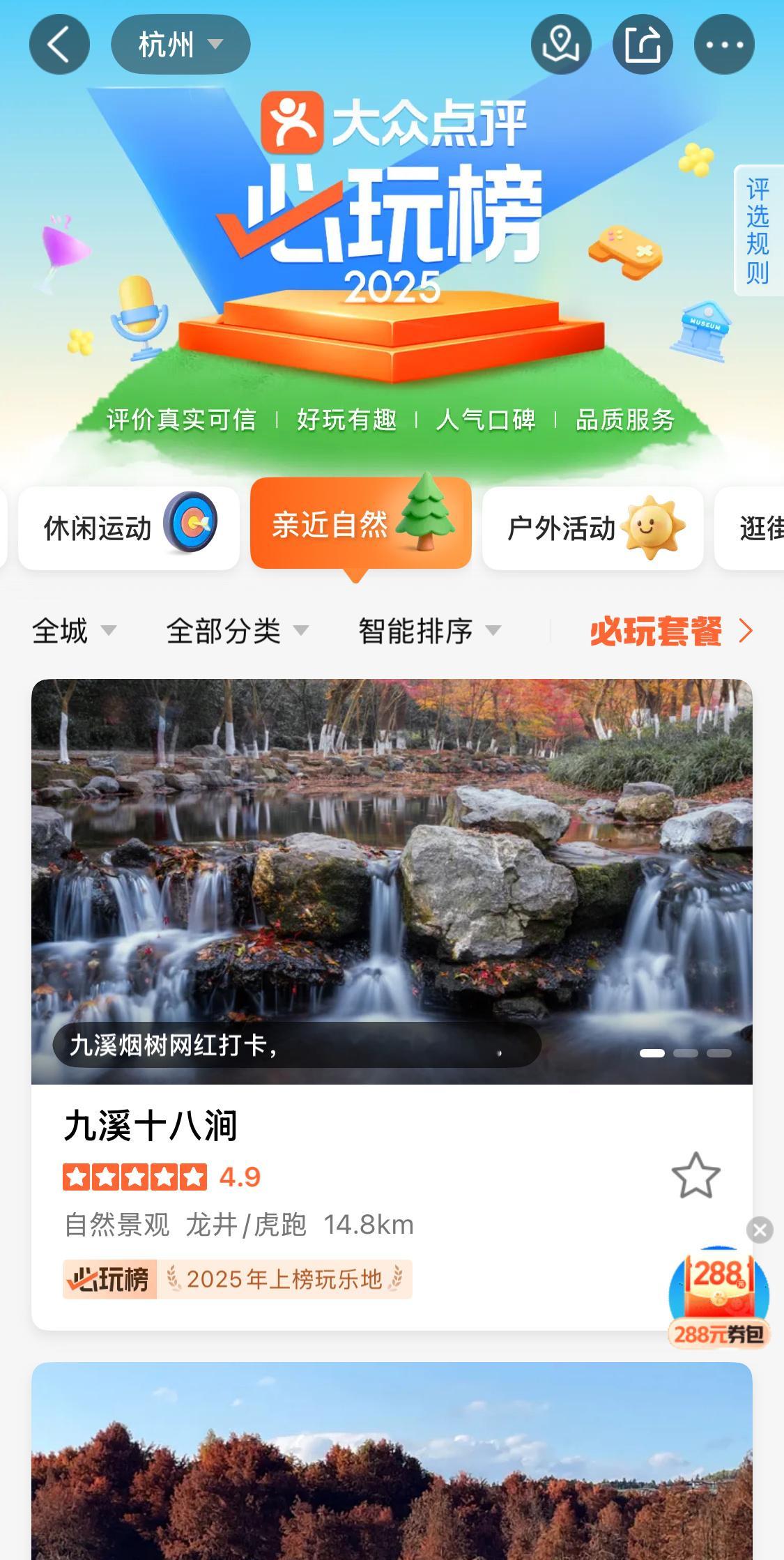 如今更多人转向“慢体验”,今年我和朋友都选择待在杭州把大众点评上的必玩榜都逛一遍,把必吃榜上的美食,都再扫扫雷。但亲身体验一遍后,你会发现平台上的点评都足够真实,参考性很强。例如满觉陇和九溪十八涧,名气没有西湖大,但风景确实不错,网友推荐时间和小众拍照打卡点,都没问题。就连“缺点”也直说,比如整个路线会非常耗体力之类,让正在做攻略的游客有心理准备。